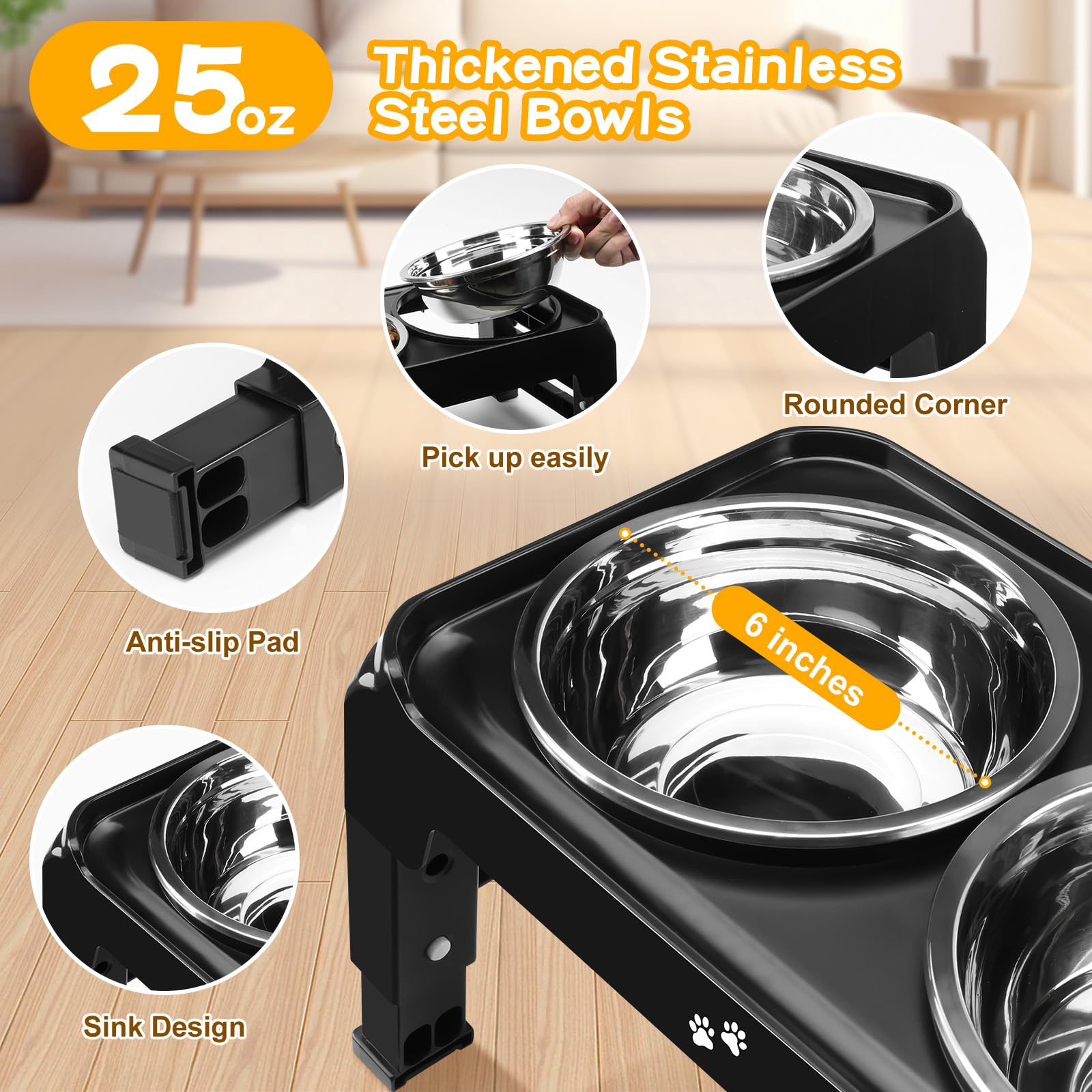 🐕Adjustable Height Dog Bowl Stand for Small & Medium Dogs: Say goodbye to bending down! Our small elevated dog bowls can be adjusted to 3 different heights: 2.75", 6", 7.5", accompany then from puppy to full grown. The raised dog bowl can not only makes it easier and comfortable for dogs to access their food and water, but also prevents dust or floor debris from falling into the bowls, ensuring a clean and healthy dining experience.