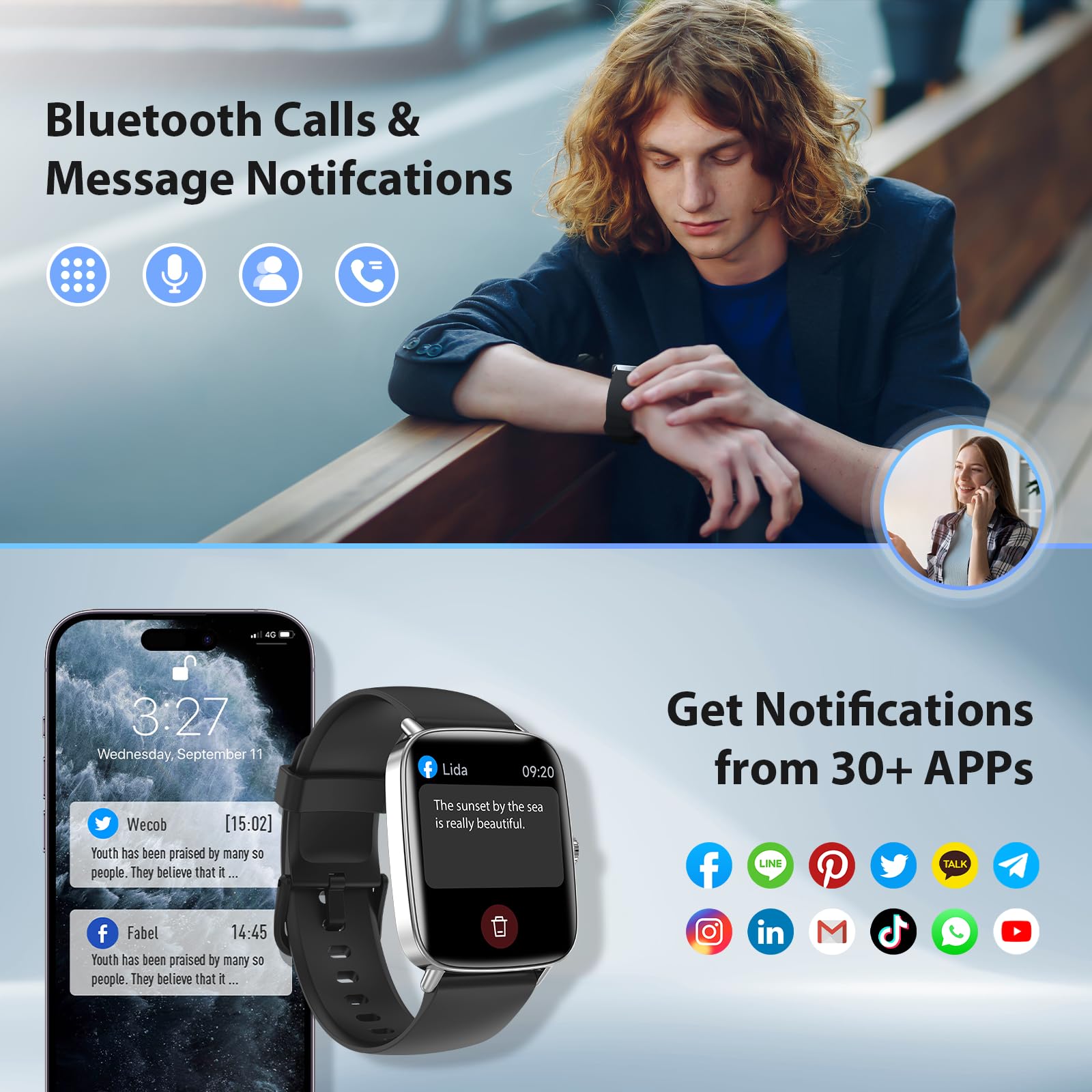 STAY CONNECTED ON YOUR WRIST: Stay seamlessly connected to the outside world. Powered by faster, more stable Bluetooth 5.3, smart watch support answer/make calls, receive texts/app notifications, and can be used with an AI voice assistant at your service. (Note: Message sending/reply functions not supported)