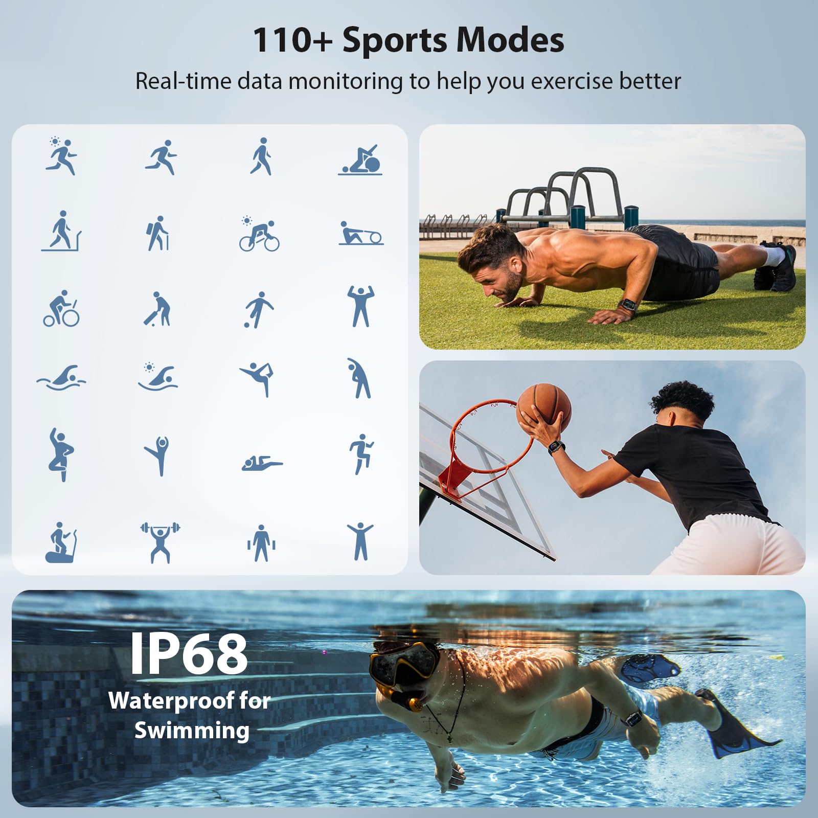 PREMIUM FITNESS PARTNER: This fitness tracker supports up to 110+ mainstream exercise modes, acquires advanced metrics for various workouts, and tracks the intensity of your workout.Its IP68 waterproof rating ensures confidence during aquatic adventures or daily use.