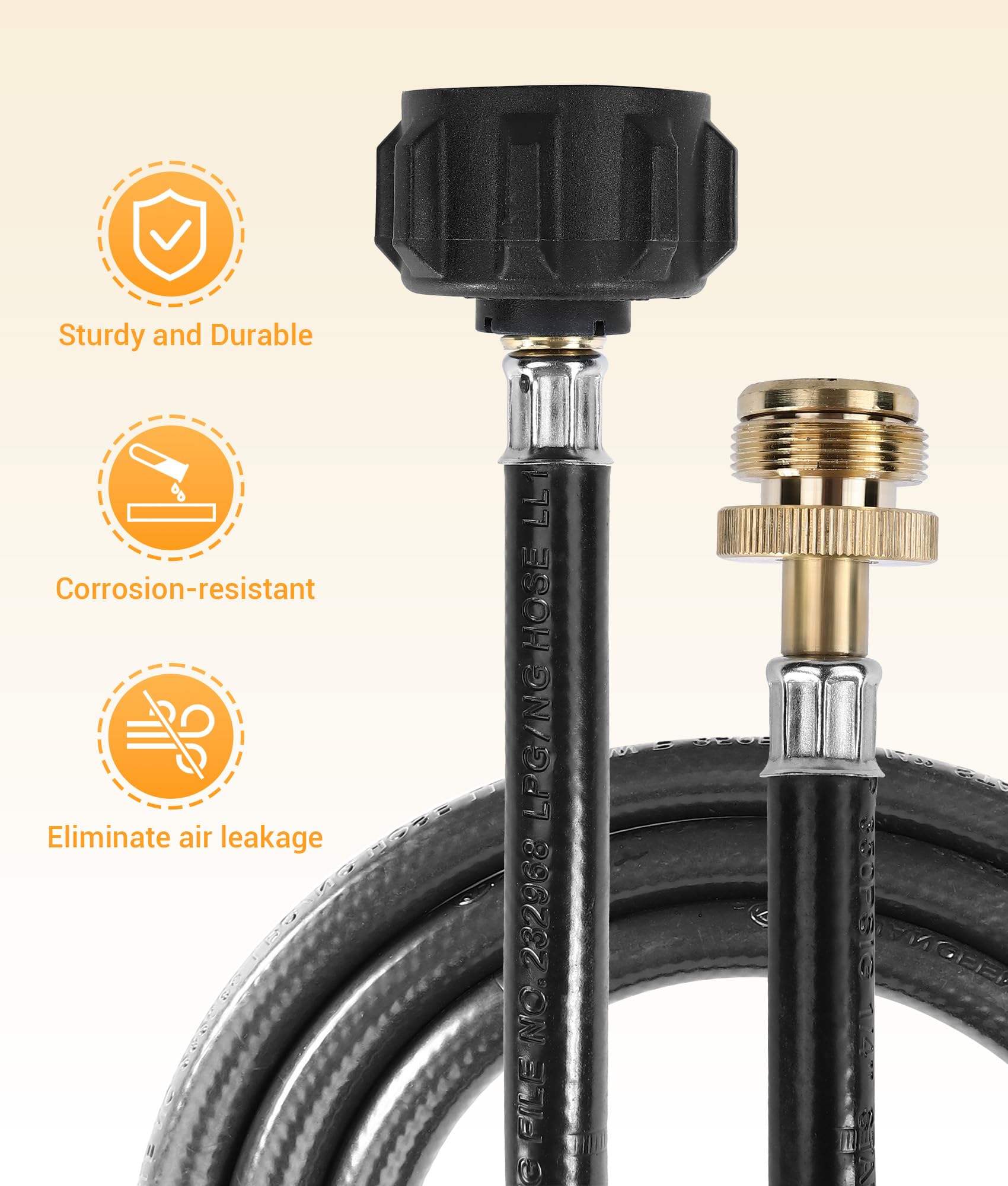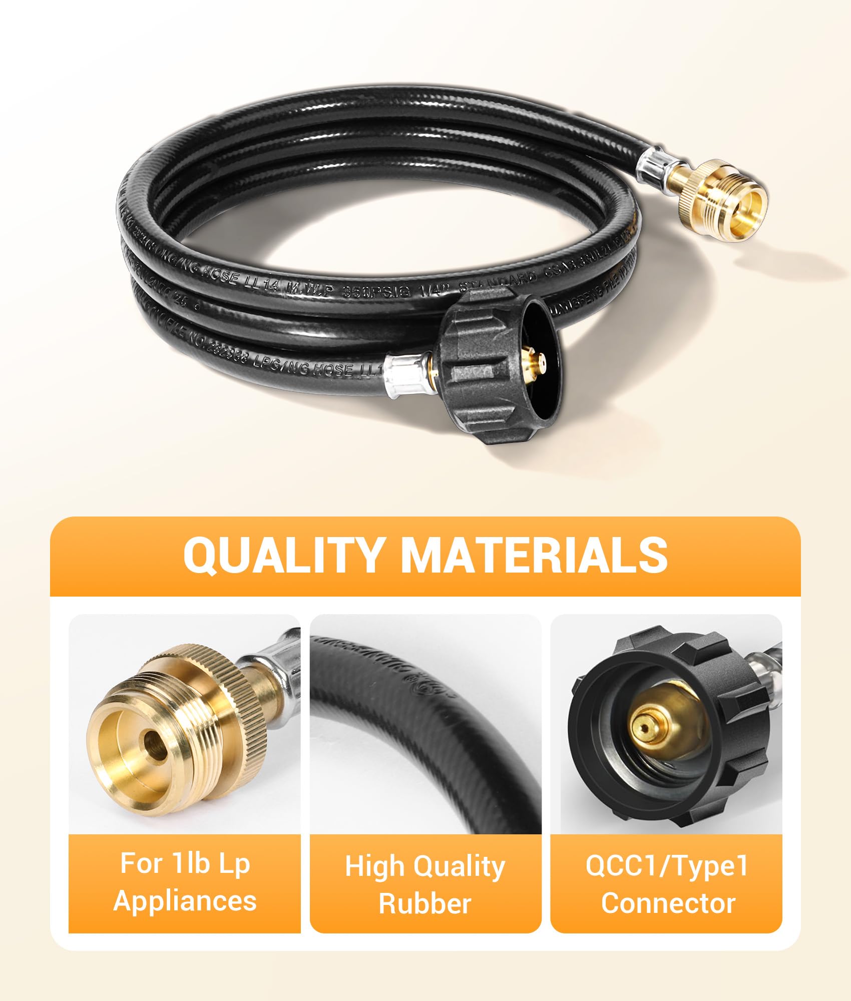 Standard Connector: Equipped with a QCC-1 fitting and a 1"-20 male throwaway cylinder thread, this propane tank hose is easy to use and connect to your appliances