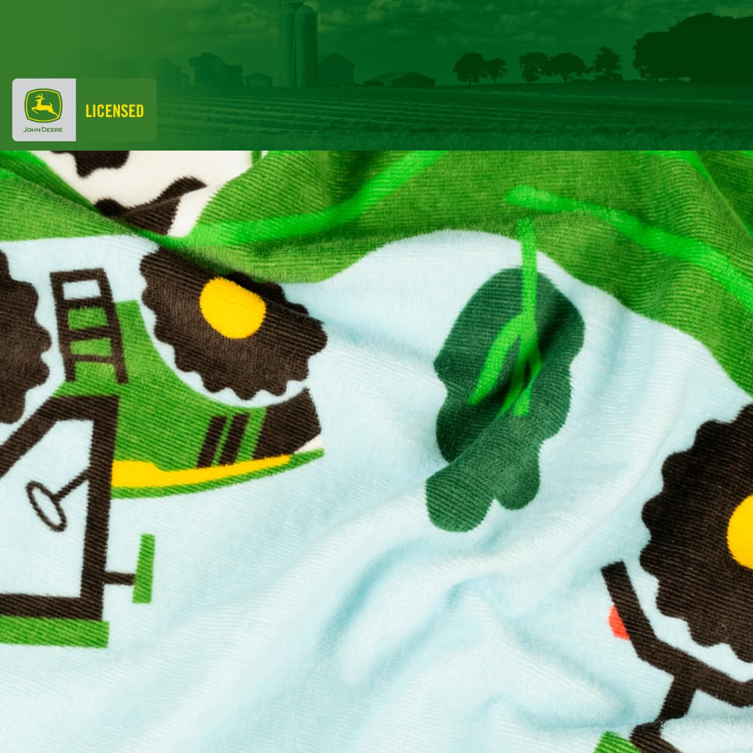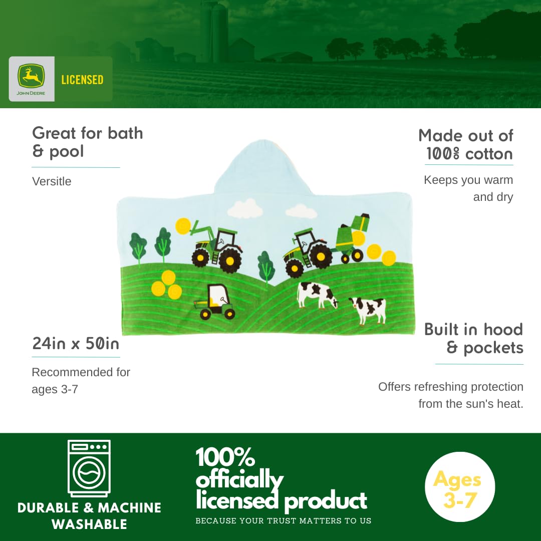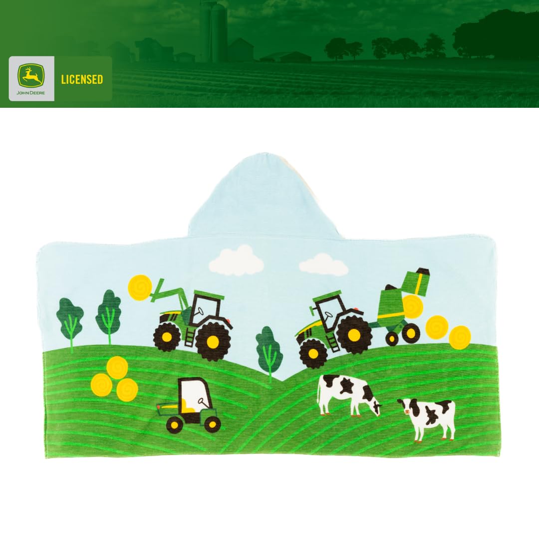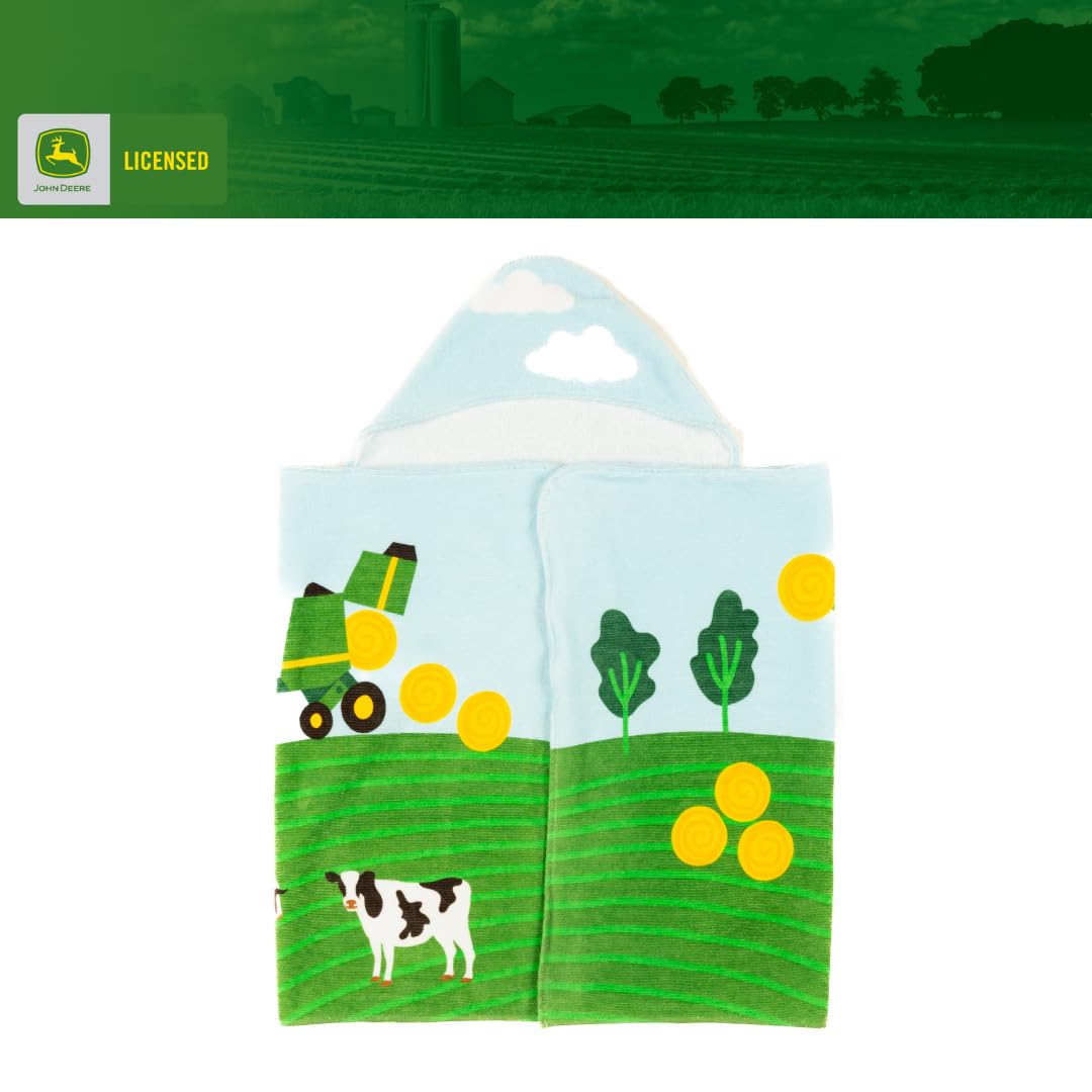 JOHN DEERE DESIGN: Kids can dry off in farm-fresh style with this cozy John Deere hooded towel. Featuring tractors, cows, and green rolling fields, this wrap combines comfort with the iconic look of America’s favorite tractor brand.