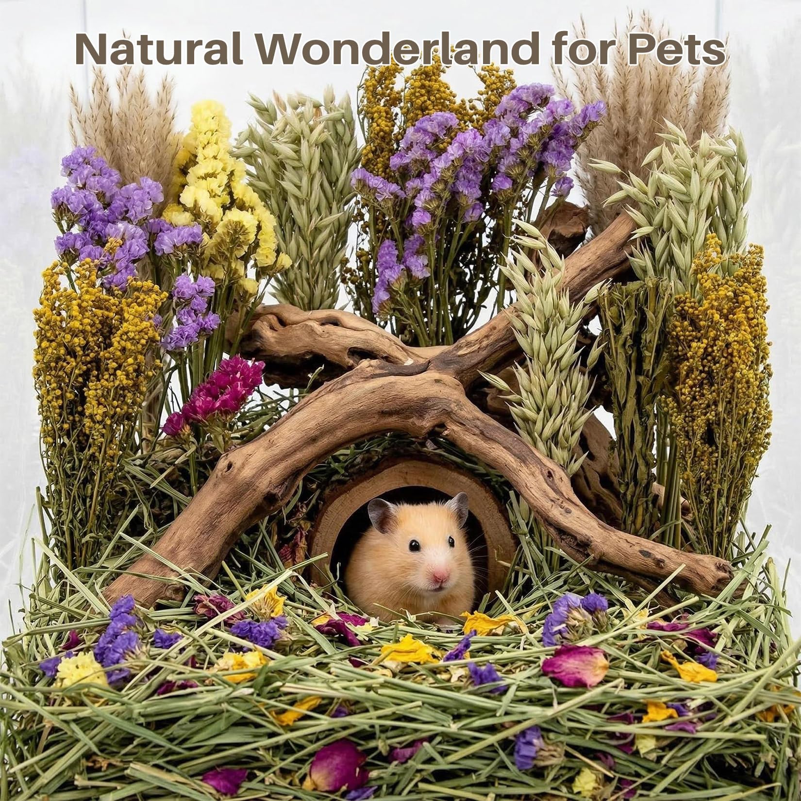 Perfect for Pets: Suitable for hamsters, dwarf hamsters, guinea pigs, golden bears, chipmunks, rabbits, hedgehogs, chinchillas, birds and other small animals. Cute pets can not only appreciate the different textures of natural dried flowers, yellow forget-me-nots, purple forget-me-nots, oatmeal, oriole flowers and other dried flowers in the den, but the little hamsters can enrich their experience by chewing them, making them a good chew