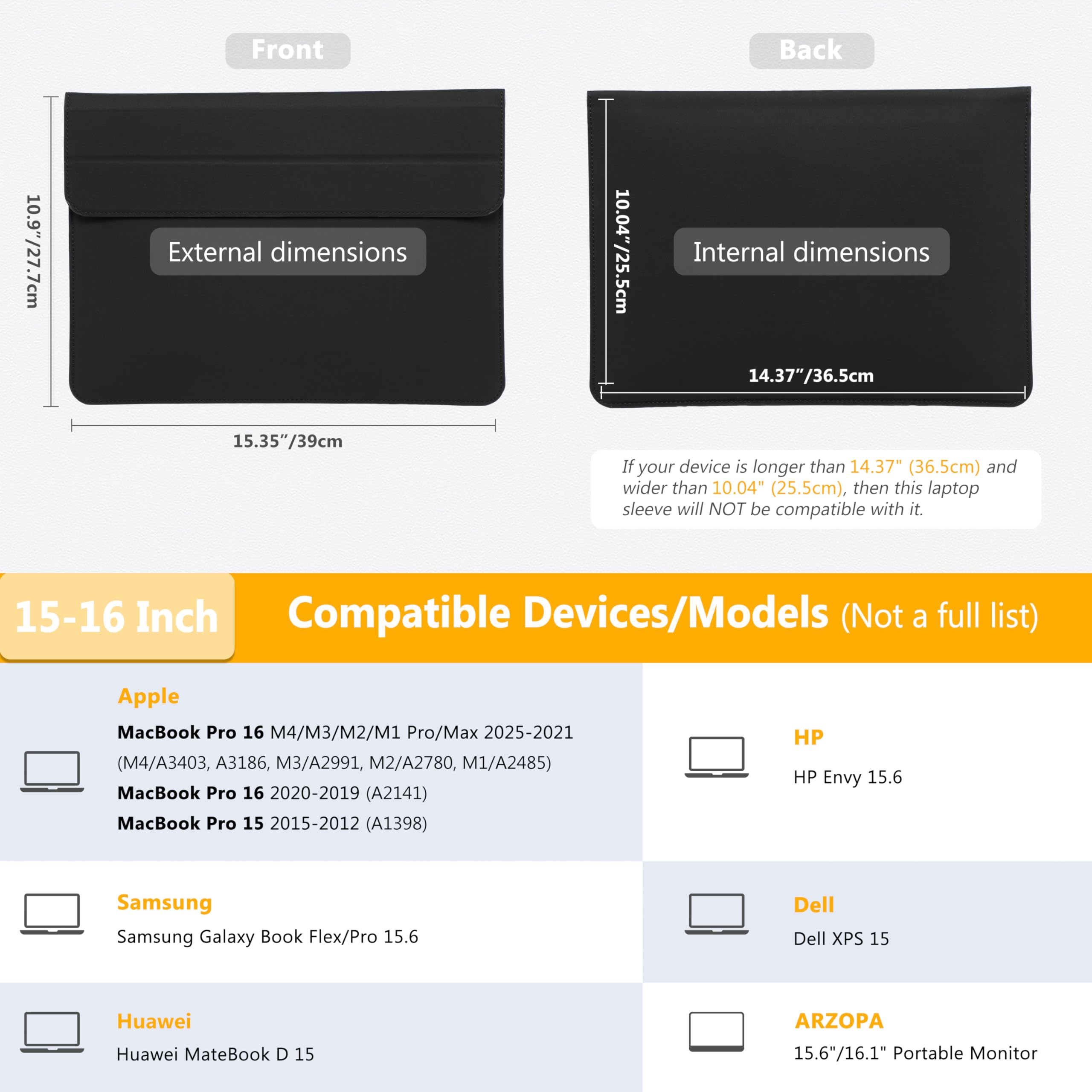 Internal Dimensions: 14.37" x 10.04" (36.5 cm x 25.5 cm). Compatible with MacBook Pro 16 M5/M4/M3/M2/M1 Pro/Max 2026-2019 (A3428, A3429, A3403 A3186 A2991 A2780 A2485 A2141), Compatible with MacBook Pro 15 2015-2012 (A1398), Compatible with Dell XPS 15, Compatible with HP Envy 15.6, Compatible with Huawei MateBook D 15, Compatible with Samsung Galaxy Book Flex/Pro 15, Compatible with ARZOPA 15.6"/16.1" Portable Monitor, etc.