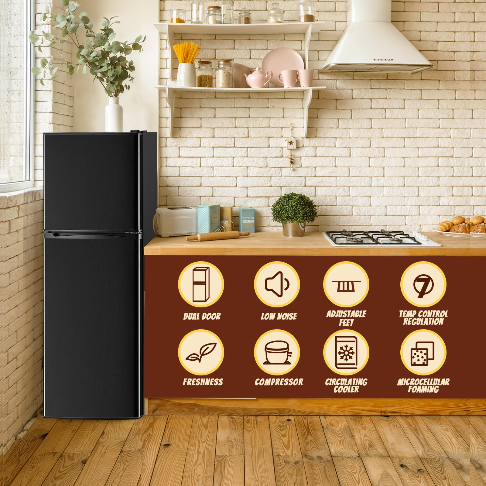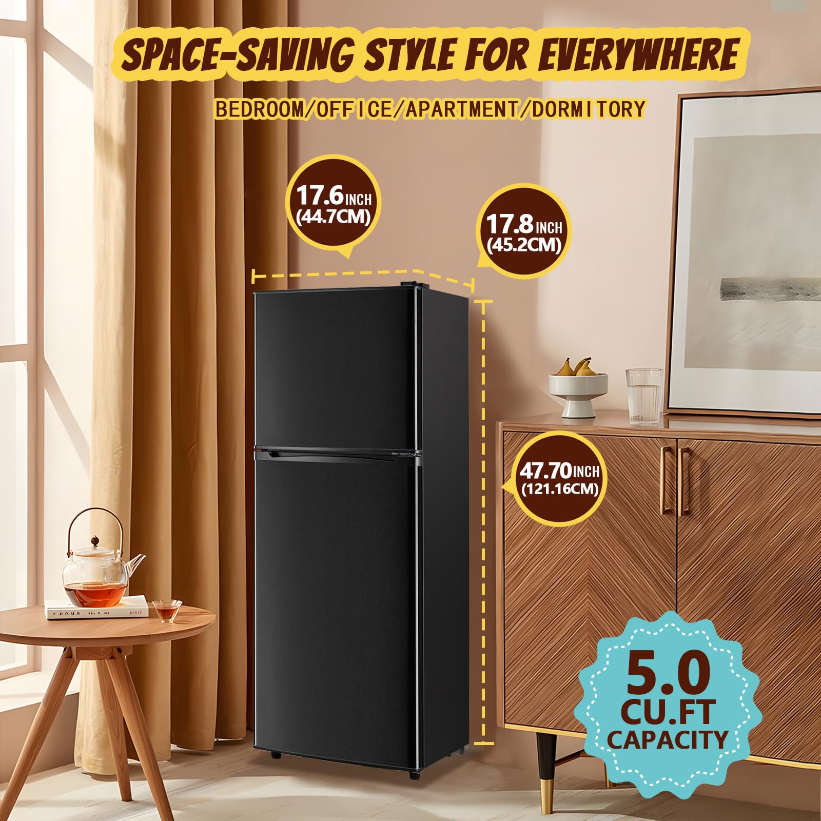 2-Door Design with Top Freezer: This mini fridge boasts a 5.0 cu. ft large capacity(Size: 17.72"D x 17.52"W x 47.64"H), featuring a 1.8 cu. ft top freezer and a 3.2 cu. ft bottom fridge, perfect for organizing and storing a variety of items, from frozen goods to fresh foods and beverages