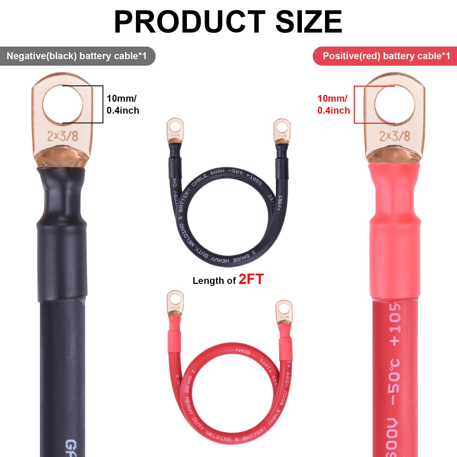 【Heavy Duty Safe Battery Cables】This 2AWG battery cable is made of 1070 strands of 0.2mm AS copper wire. 3/8'' ring terminal at each end(already crimped). The cable is an ultra flexible pure copper cable manufactured with a tough, solvent resistant. Please refer to the photo gallery for a cable specification chart ( stranding,voltage,insulation and copper thickness, etc.)