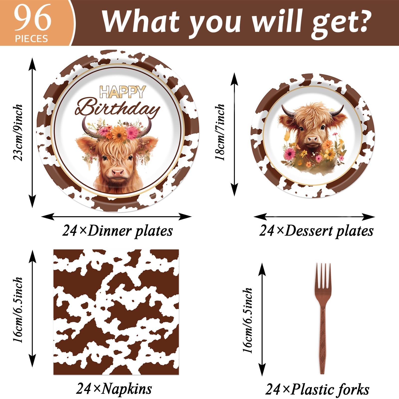 Package included: You will receive 24 pcs 9" highland cow birthday paper plates, 24 pcs 7" highland cow paper plates, 24 pcs 6.5" highland cow napkins, and 24 pcs plastic forks, each set can serve 24 guests.