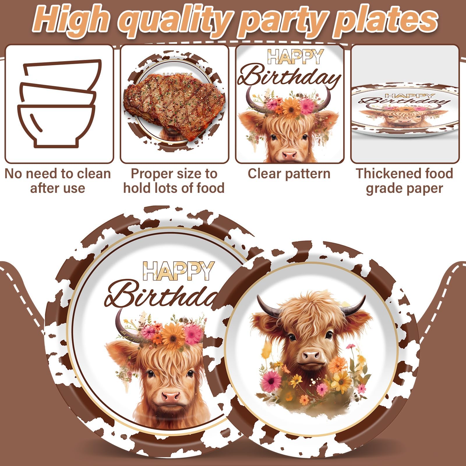 Wide application: This cow birthday dessert plates could apply for western party, cow party, western farm party, birthday party, baby shower party etc, wonderful for indoor and outdoor uses: dinning, home, kitchen, restaurant, catering, cafe, BBQ, buffets etc. These highland cattle themed disposable tableware supplies packs also are a wonderful complement with your party tablecloth, party banner, party bags, party backdrops etc.