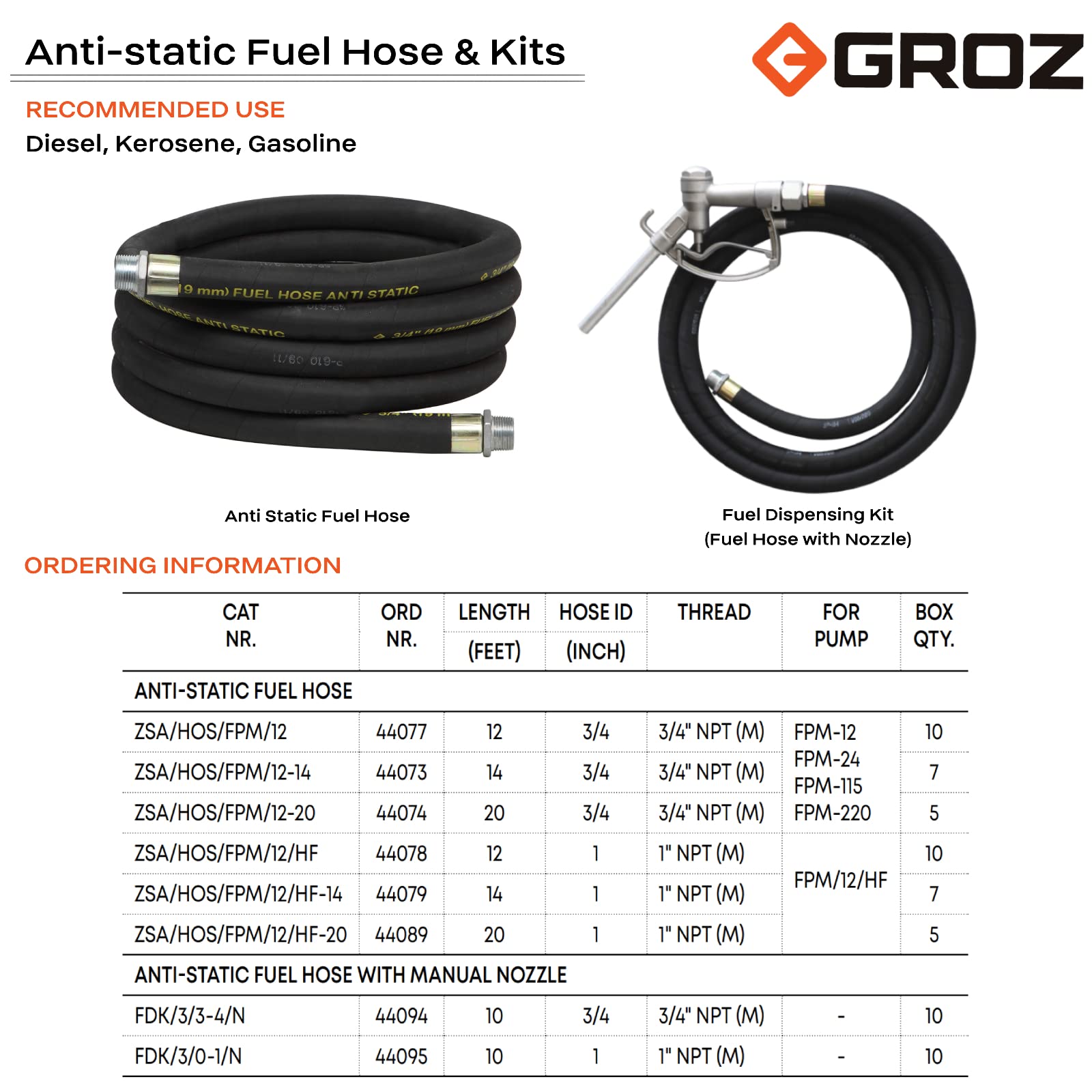 Stop wasting money on cheap fuel hoses that crack and leak after a few months. The Groz 1" NPT Fuel Hose Kit is engineered for professionals who demand reliability and safety in every fuel transfer operation. This complete gravity-feed dispensing system features a 10-foot anti-static nitrile rubber hose with embedded static wire, eliminating the fire hazard of static electricity buildup when handling volatile fuels. The professional-grade manual nozzle combines a metal body with corrosion-resistant aluminum components — the discharge spout, trigger, and protective guard are all built to withstand years of heavy commercial use. The 360-degree swivel nozzle makes positioning effortless, while the continuous flow switch allows hands-free operation for filling large tanks or multiple vehicles. With standard 1" NPT male threading and 1" internal diameter, this kit directly replaces worn hoses on most gas caddies and gravity-fed fuel systems. Ideal for fleet operators, construction sites, farms, and industrial facilities dispensing diesel, gasoline, or kerosene. Customers report this hose is "built 10x better than OEM replacements" and "the last hose you'll need to buy." Invest in quality that lasts.
