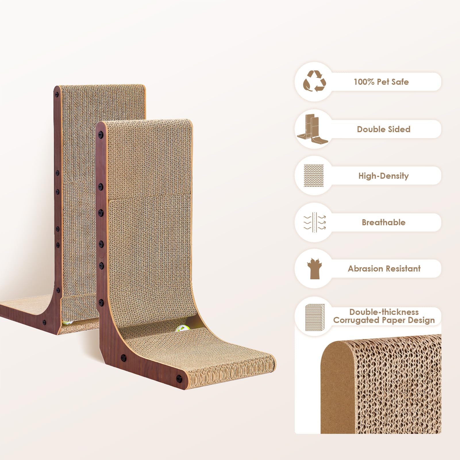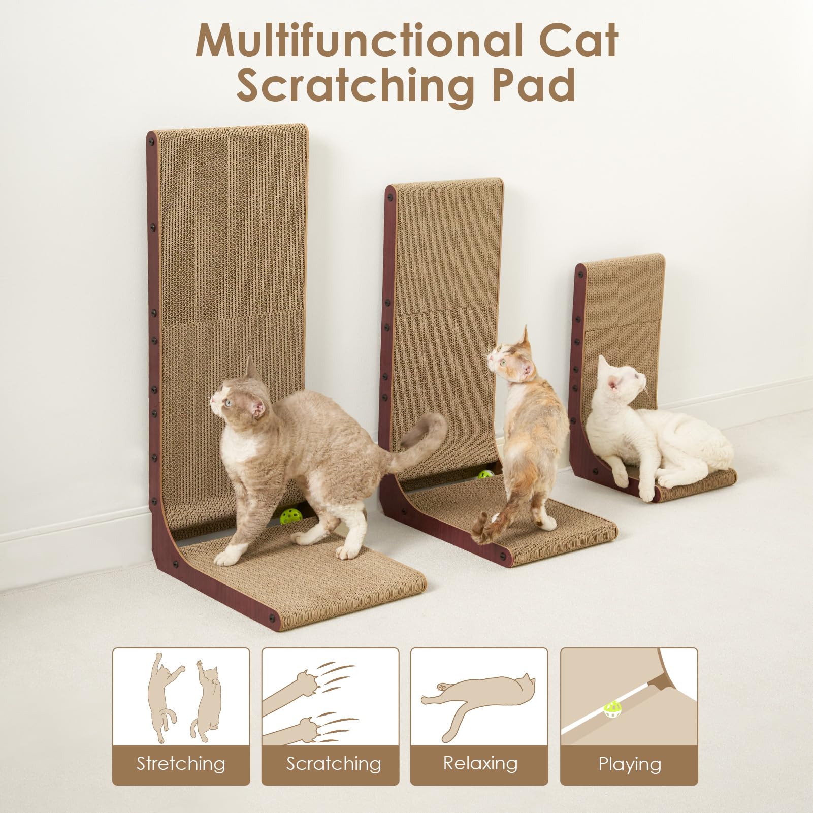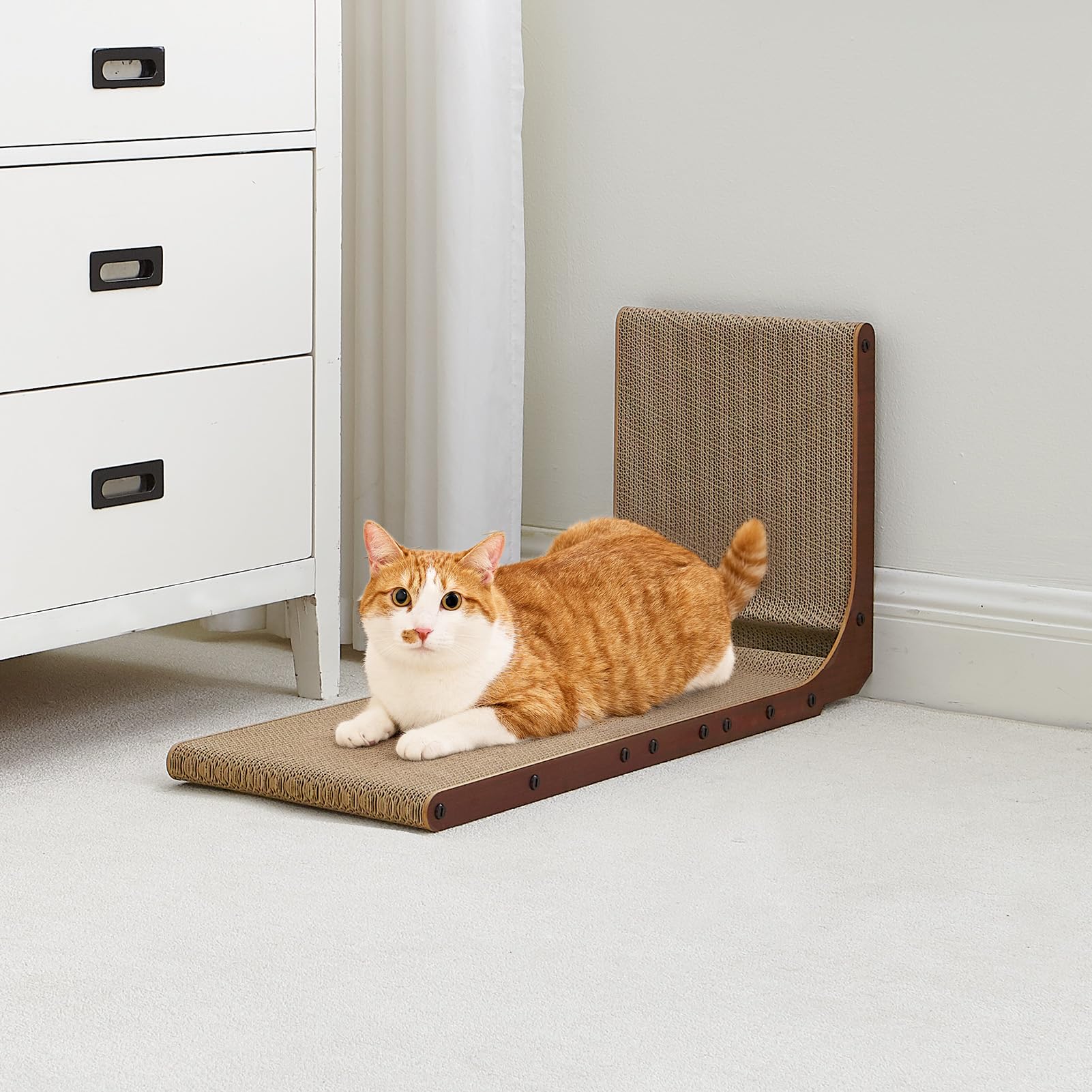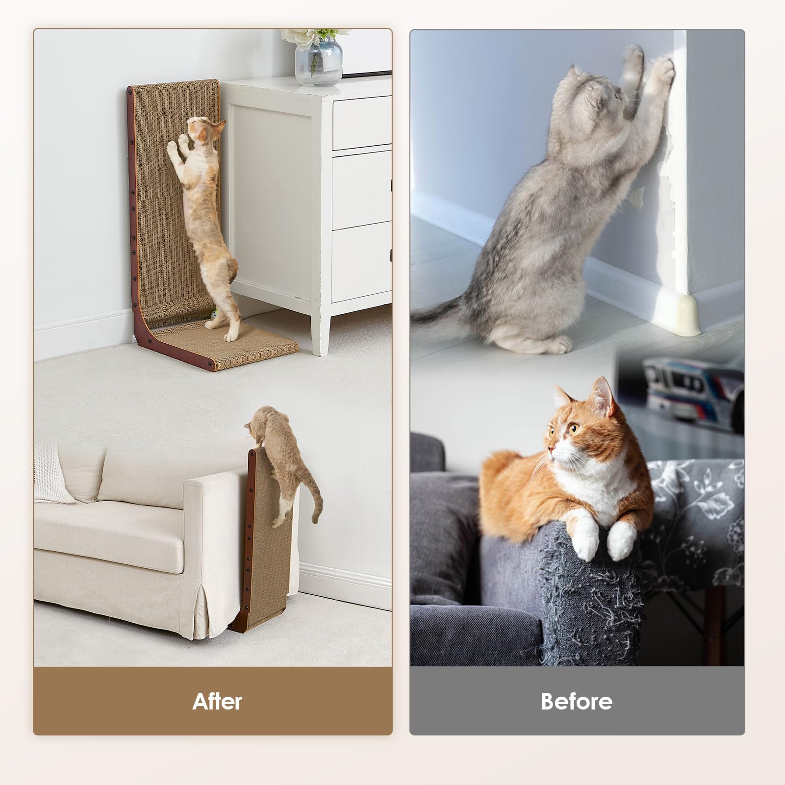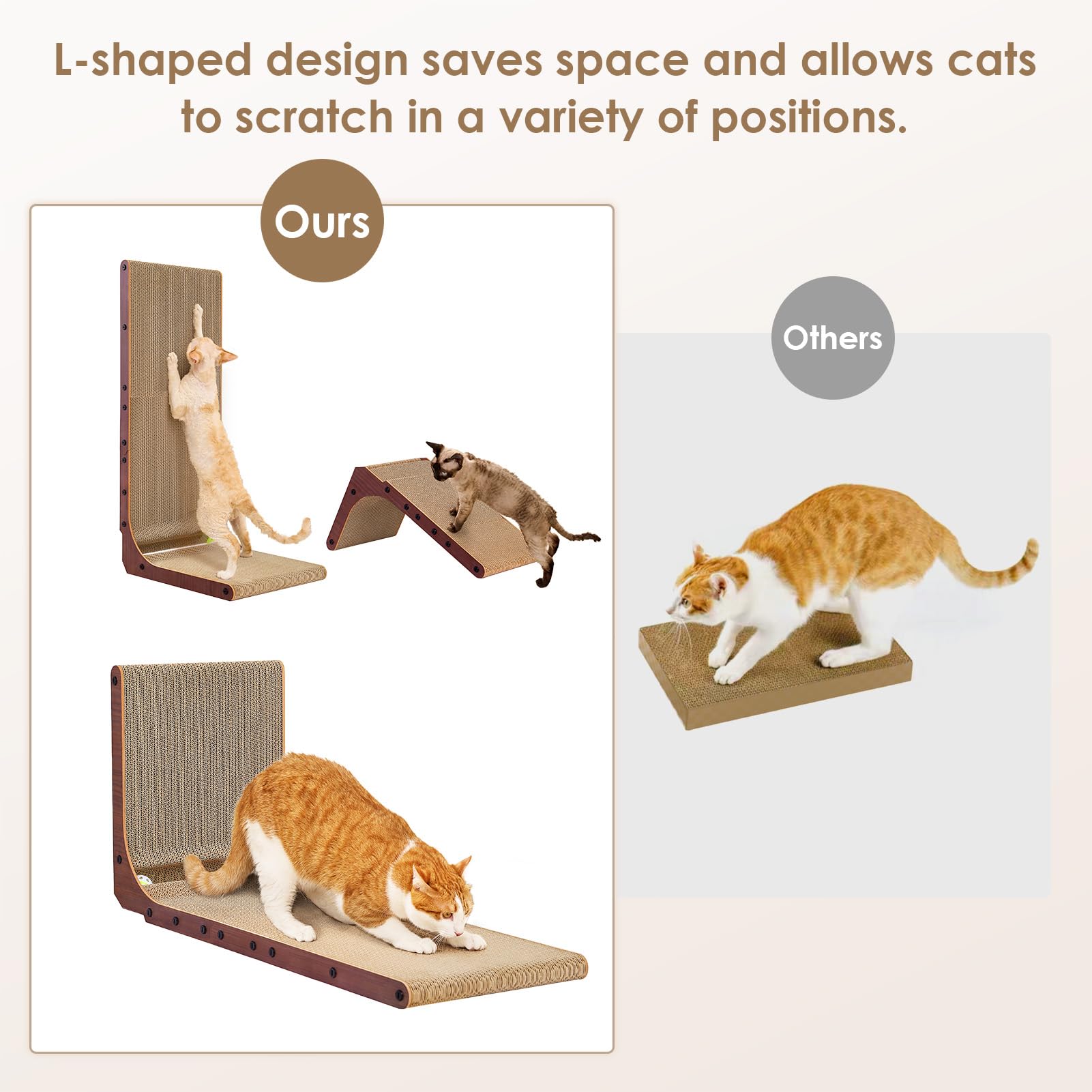 INNOVATIVE DESIGN: Our cat scratcher for indoor cats features an L-shaped design. Please place it against wall and sofa to protect your furniture. The L-shaped cat scratcher provides more scratching area for cats to scratch in a variety of positions.