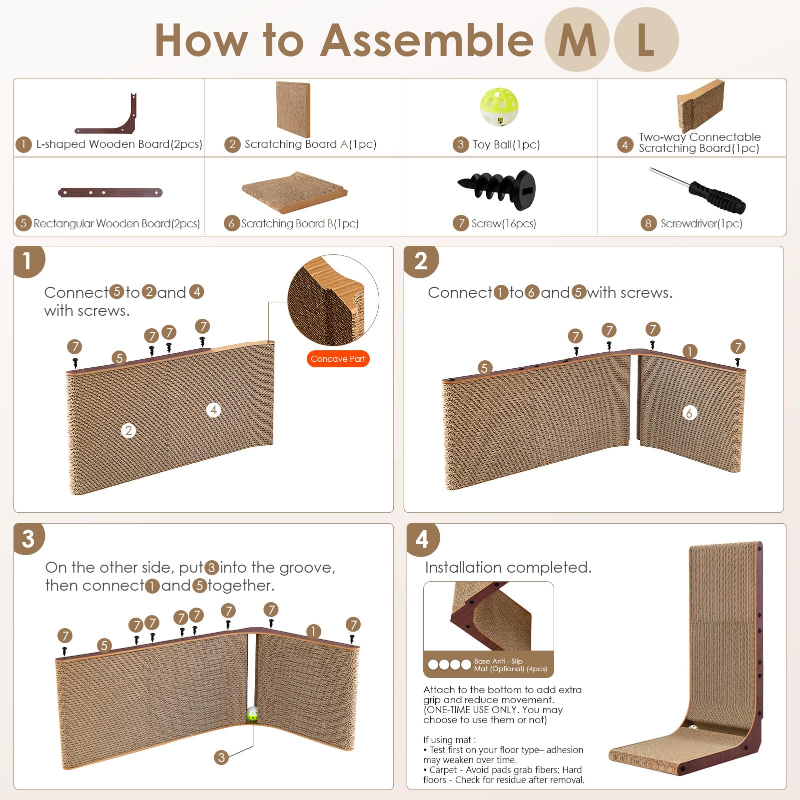 EASY INSTALLATION: Our cat scratching board adopts a simple installation method and comes with instructions and necessary tools. We also provide an installation video so that you can install it quickly and easily.