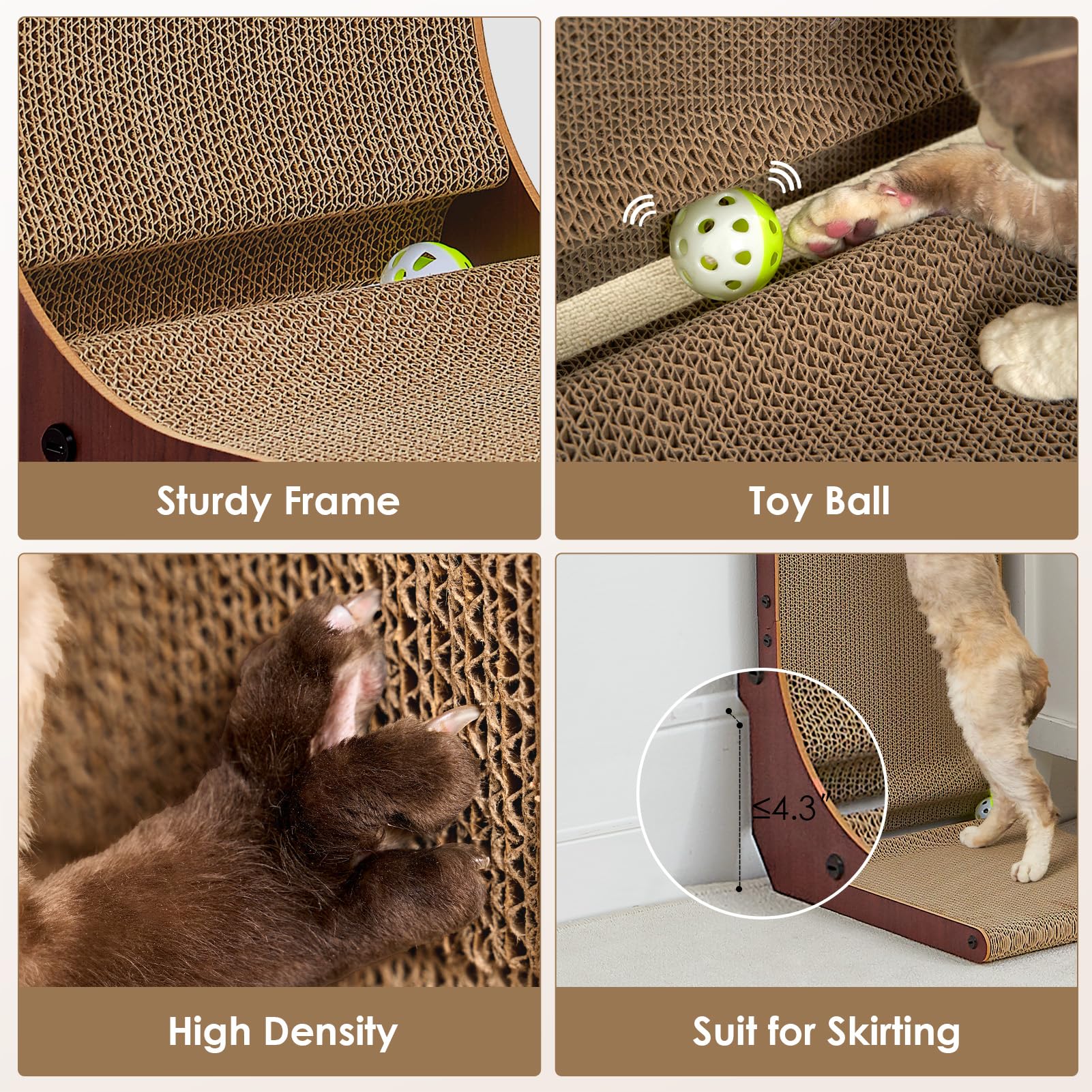 MULTIFUNCTIONAL USE: Cats can scratch, relax and stretch on our cardboard cat scratcher. Our cat scratch pad also comes with a toy ball to play with. It provides a safe and comfortable environment for cats.