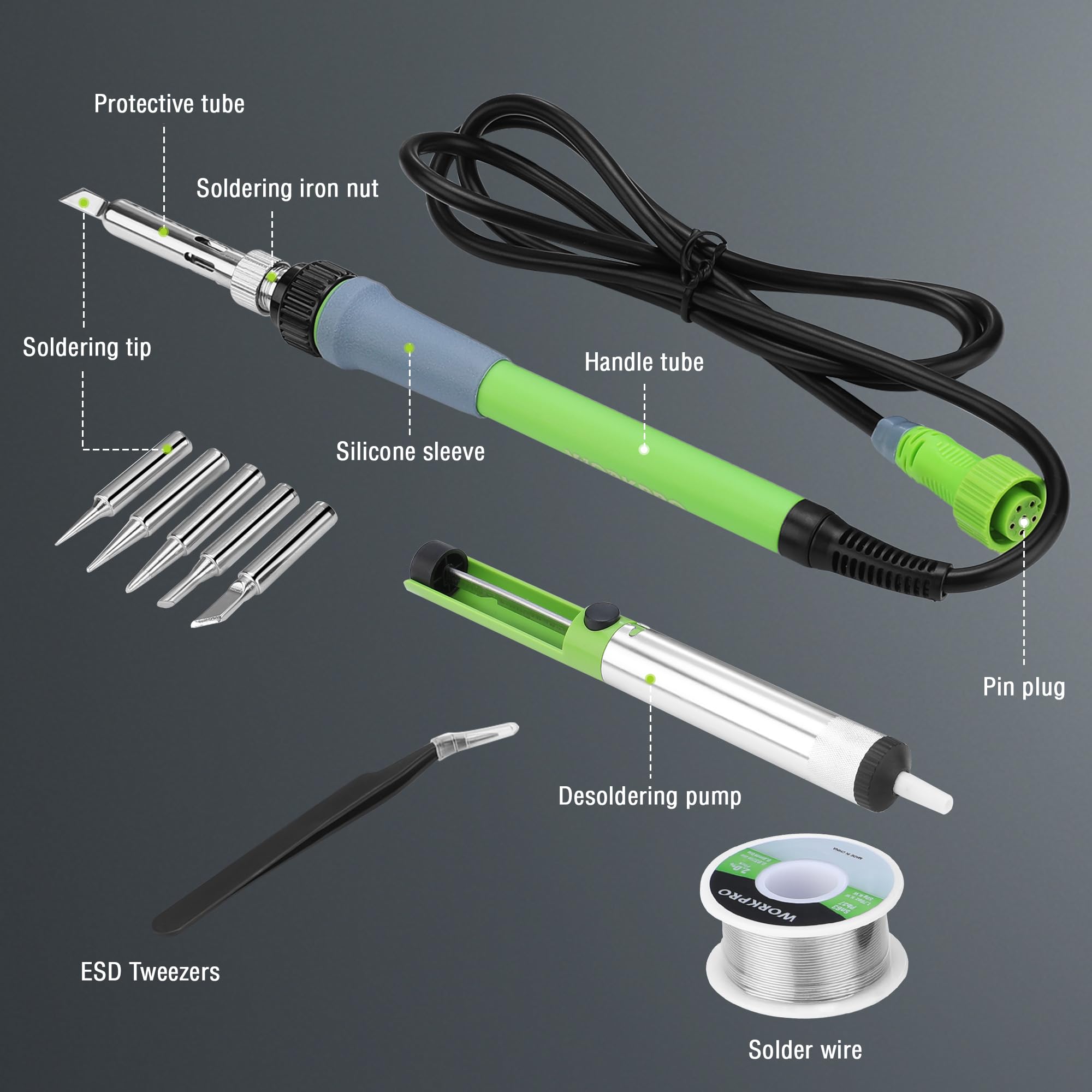 CLASSIC ALL-ROUND SOLDERING KIT: The most useful and necessary tools for soldering, including soldering iron, safety holder, cleaning sponge, 5pcs extra interchangeable solder tips, ESD tweezers, tip cleaner, solder wire and desoldering pump.