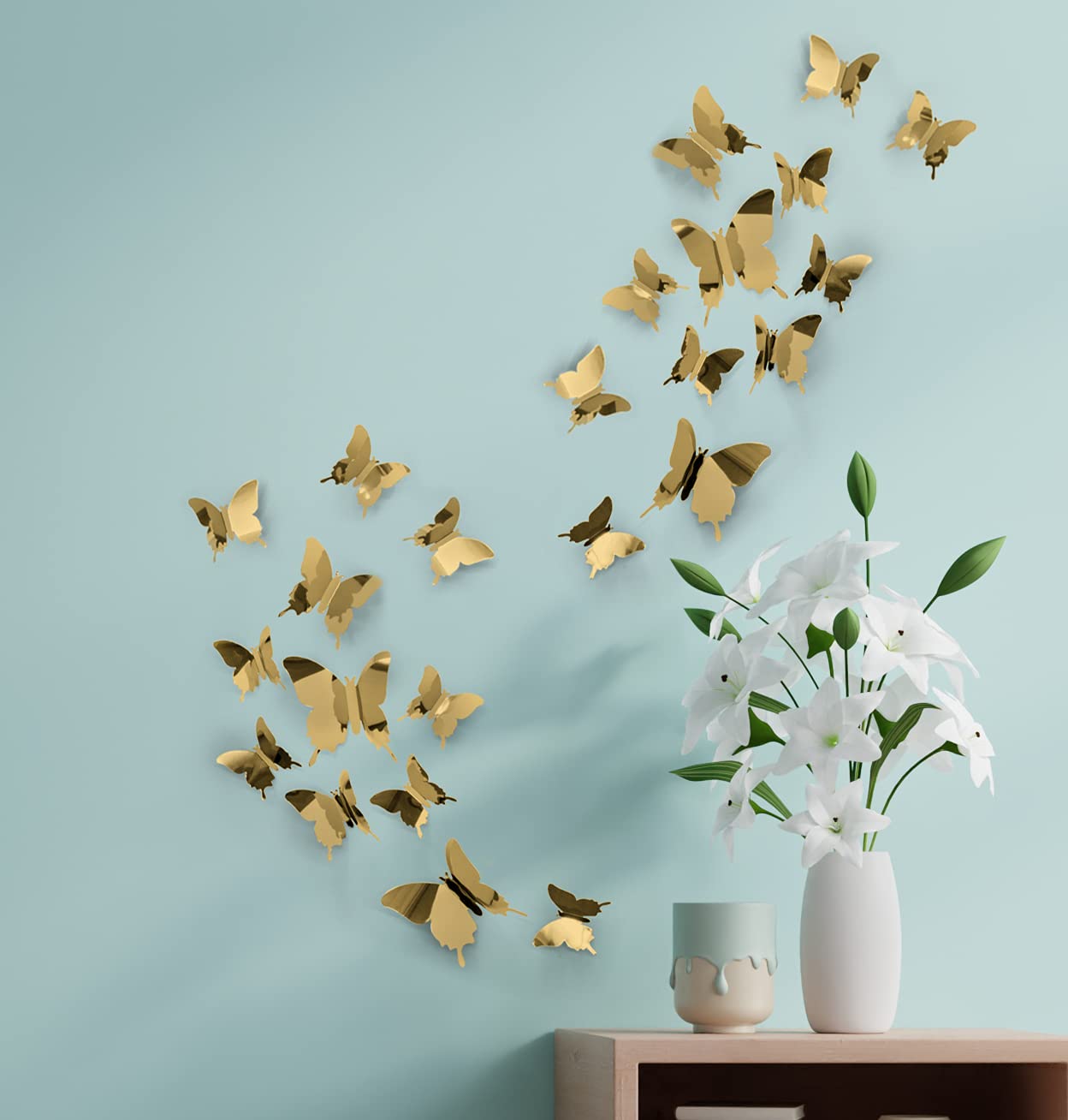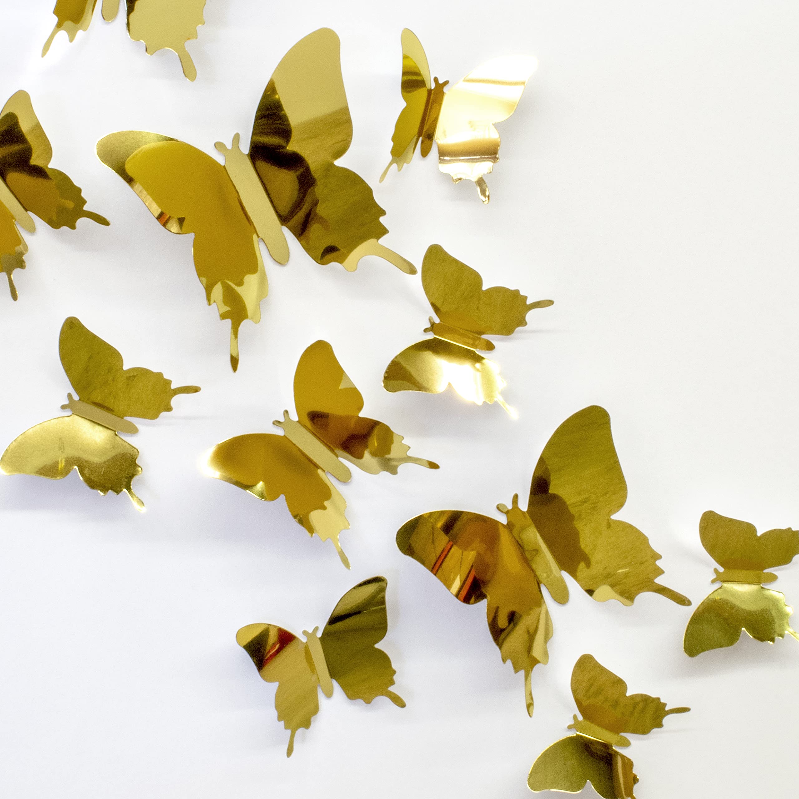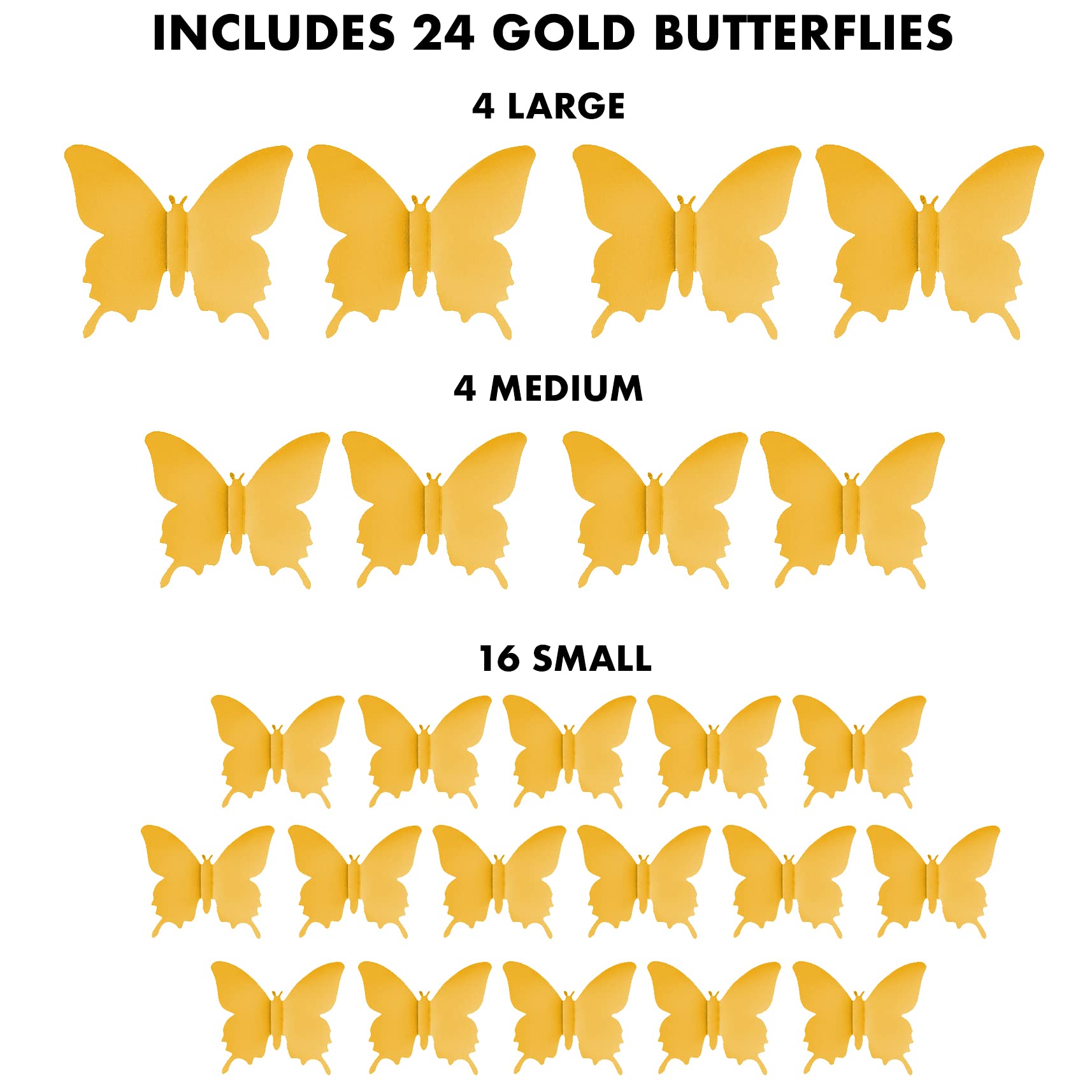 GOLD BUTTERFLY WALL DECALS - Set of 24 gold butterflies. 4 large, 4 medium, and 16 small butterflies with adhesives. Please see images for specific sizes.