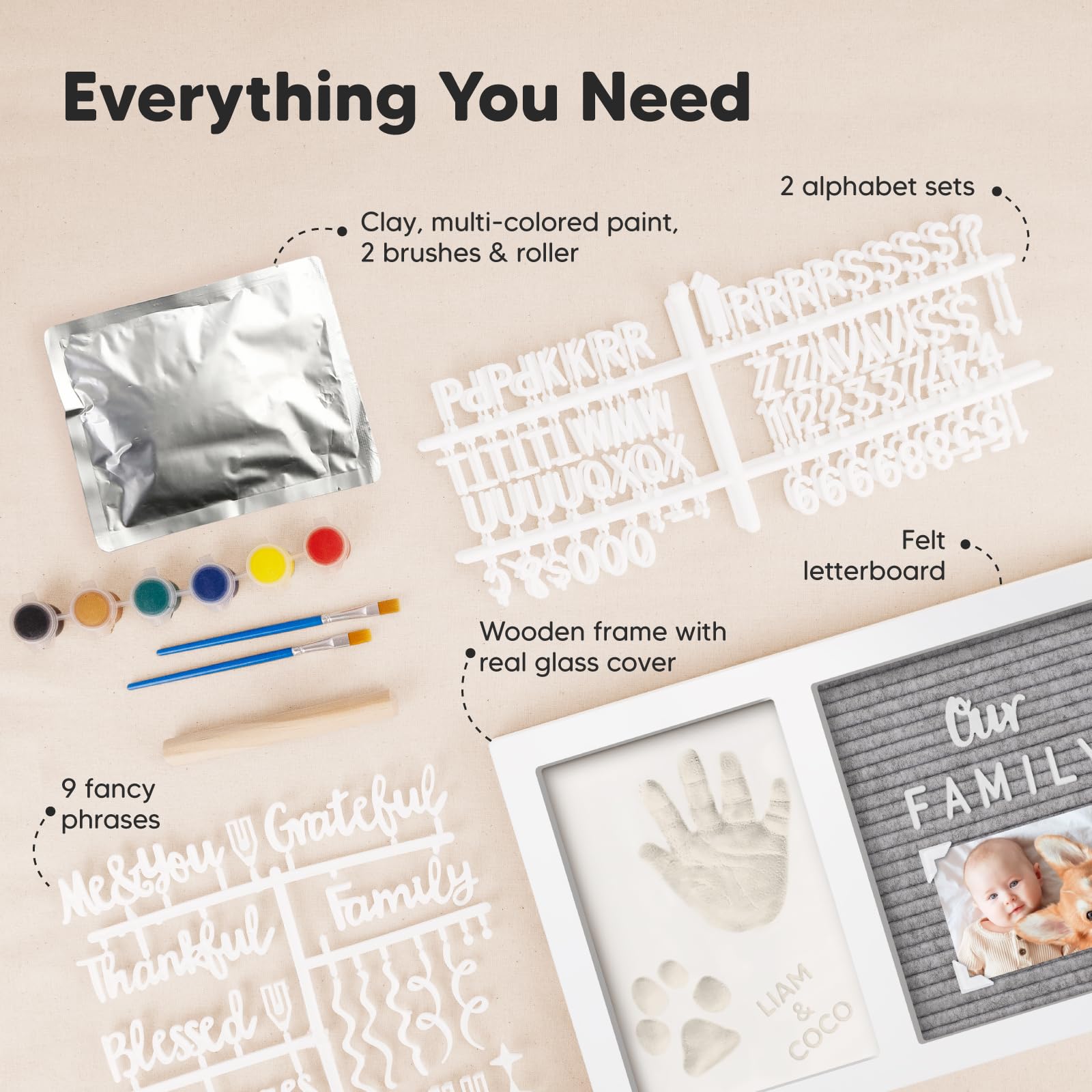 Personalized Baby Gift - The Heartfelt Baby Footprint Kit comes with a felt letterboard featuring letters and phrases, which allows you to create unique messages for surprises, gender reveals, births, milestones, and pregnancy announcements.