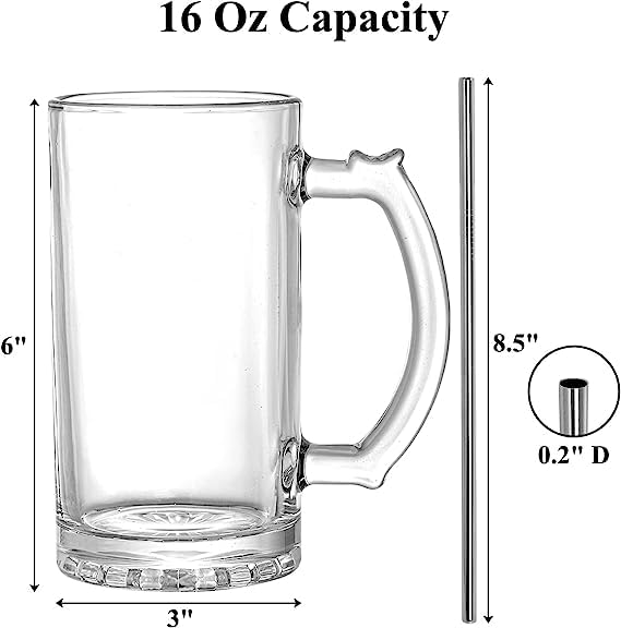 Our beer mugs set comes with 8 packs clear glass steins with handle, and 8 pieces stainless steel straws for free, reusable. Each mug measures 3" D x 6" H, and the straw measures 0.2" D x 9.5" H, perfect and easy for you to enjoy your beer.