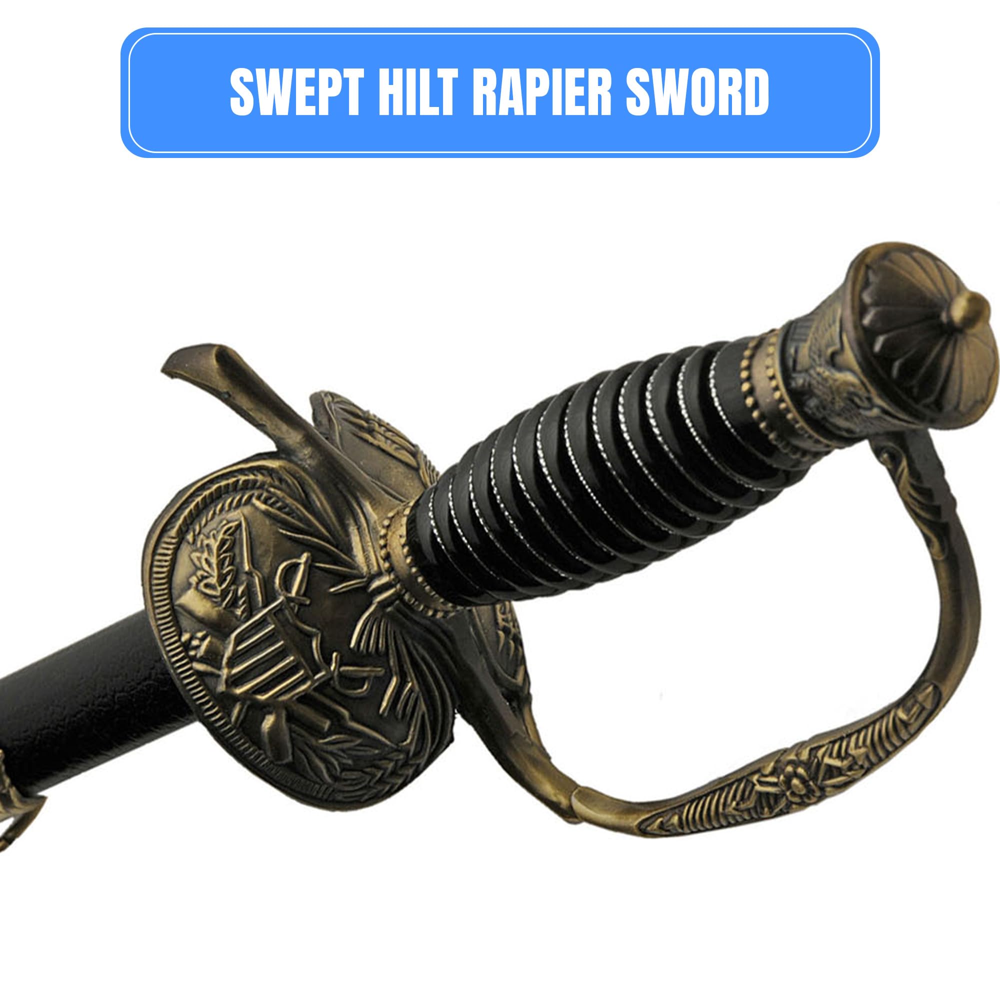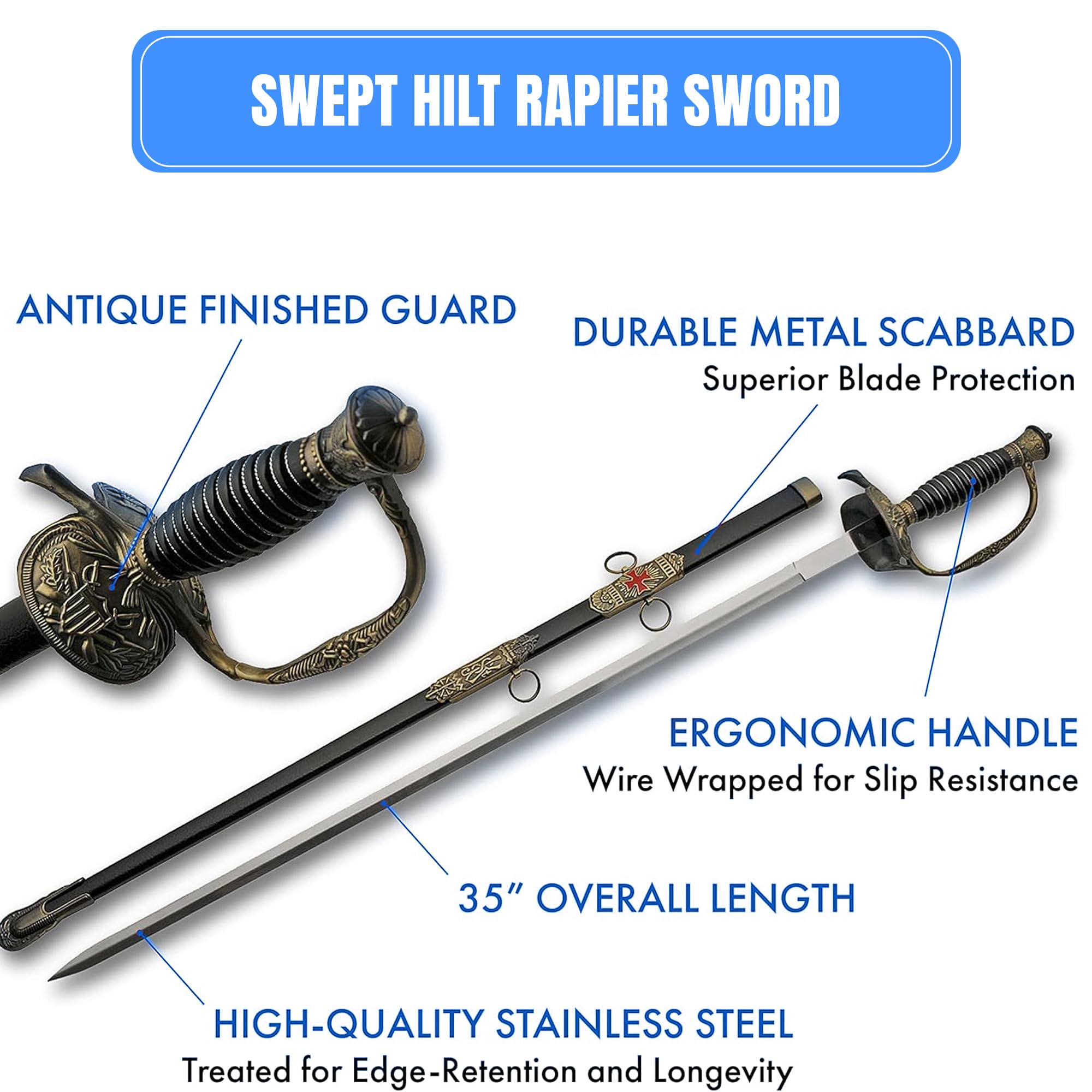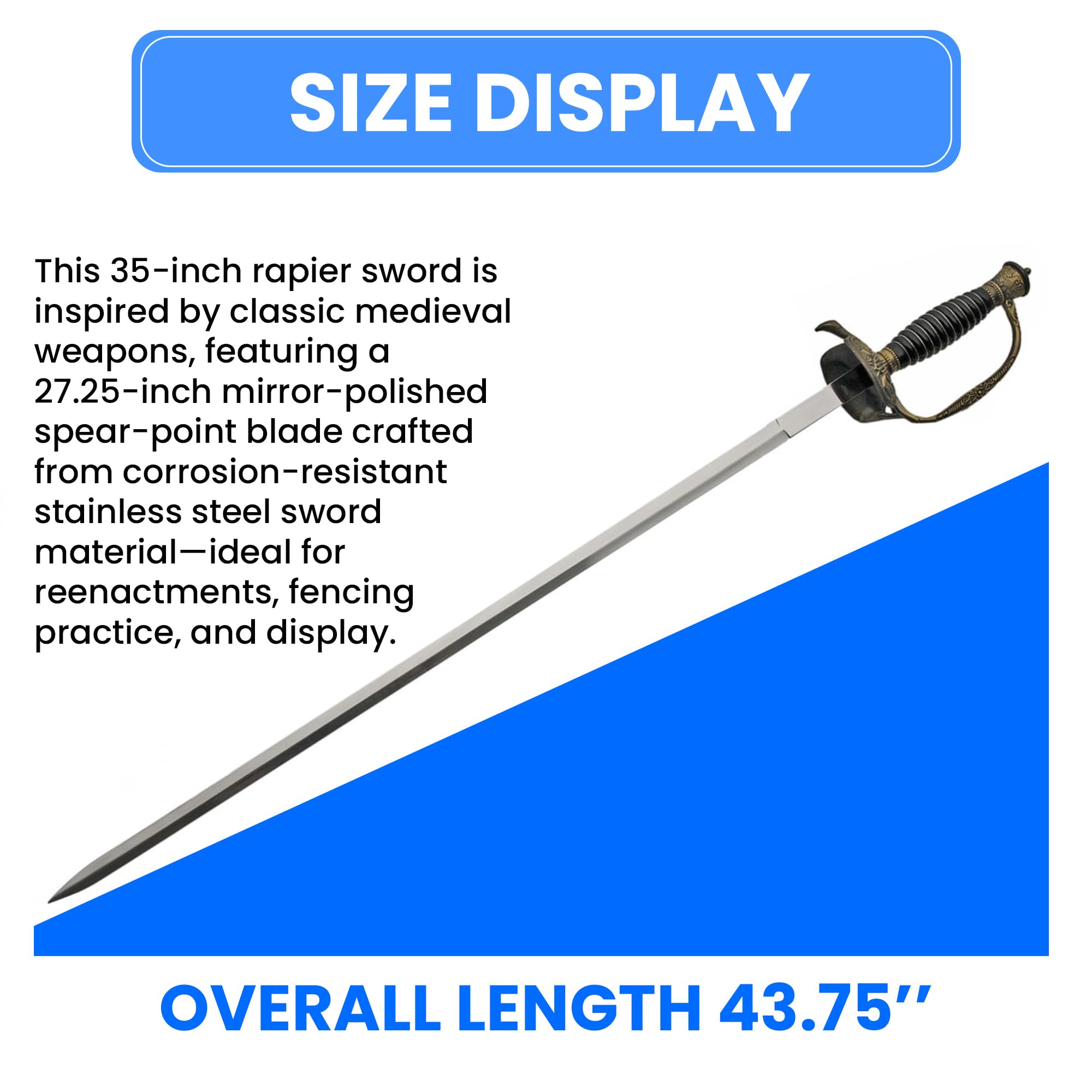 Elegant Rapier Design: This 35-inch rapier sword is inspired by classic medieval weapons, featuring a 27.25-inch mirror-polished spear-point blade crafted from corrosion-resistant stainless steel sword material—ideal for reenactments, fencing practice, and display.