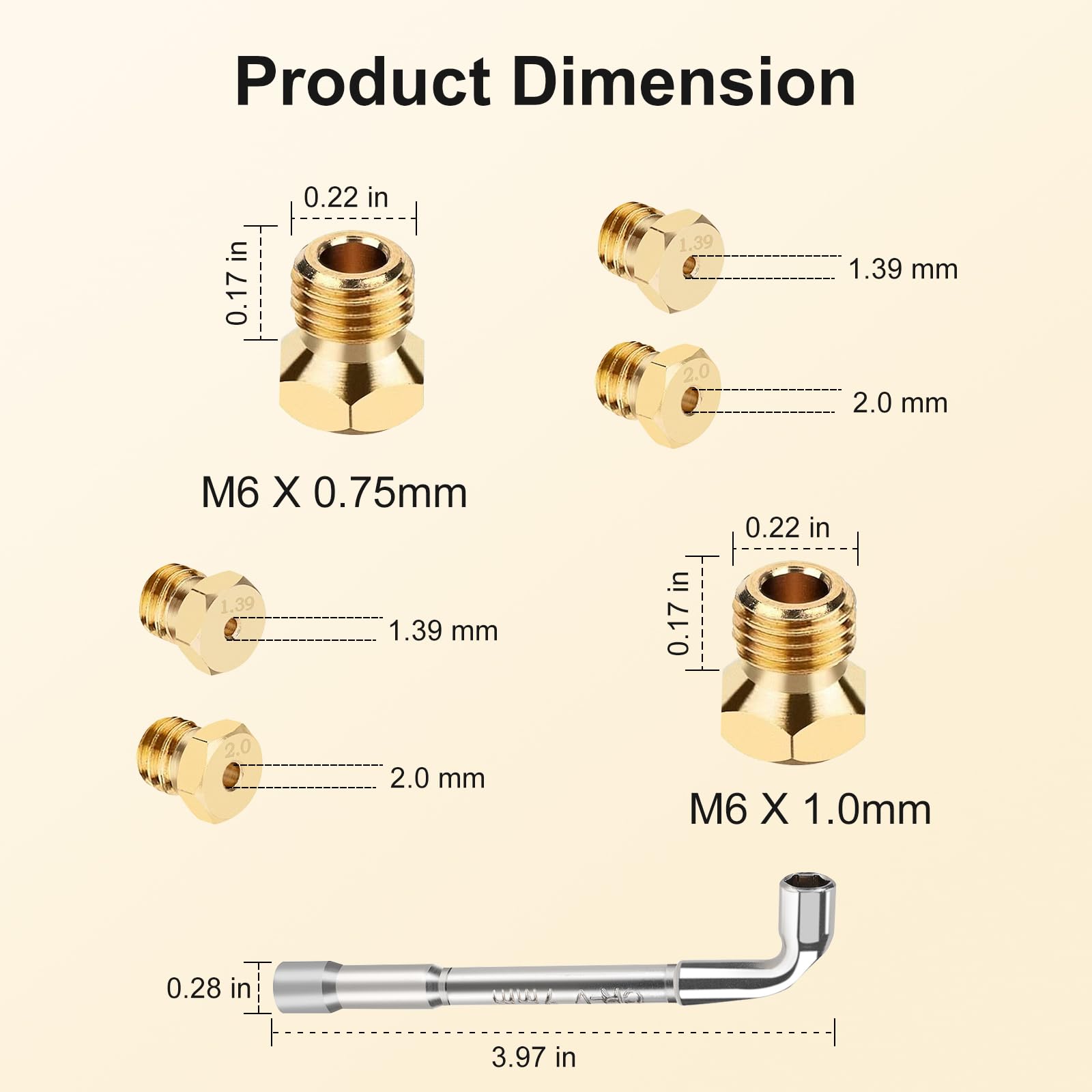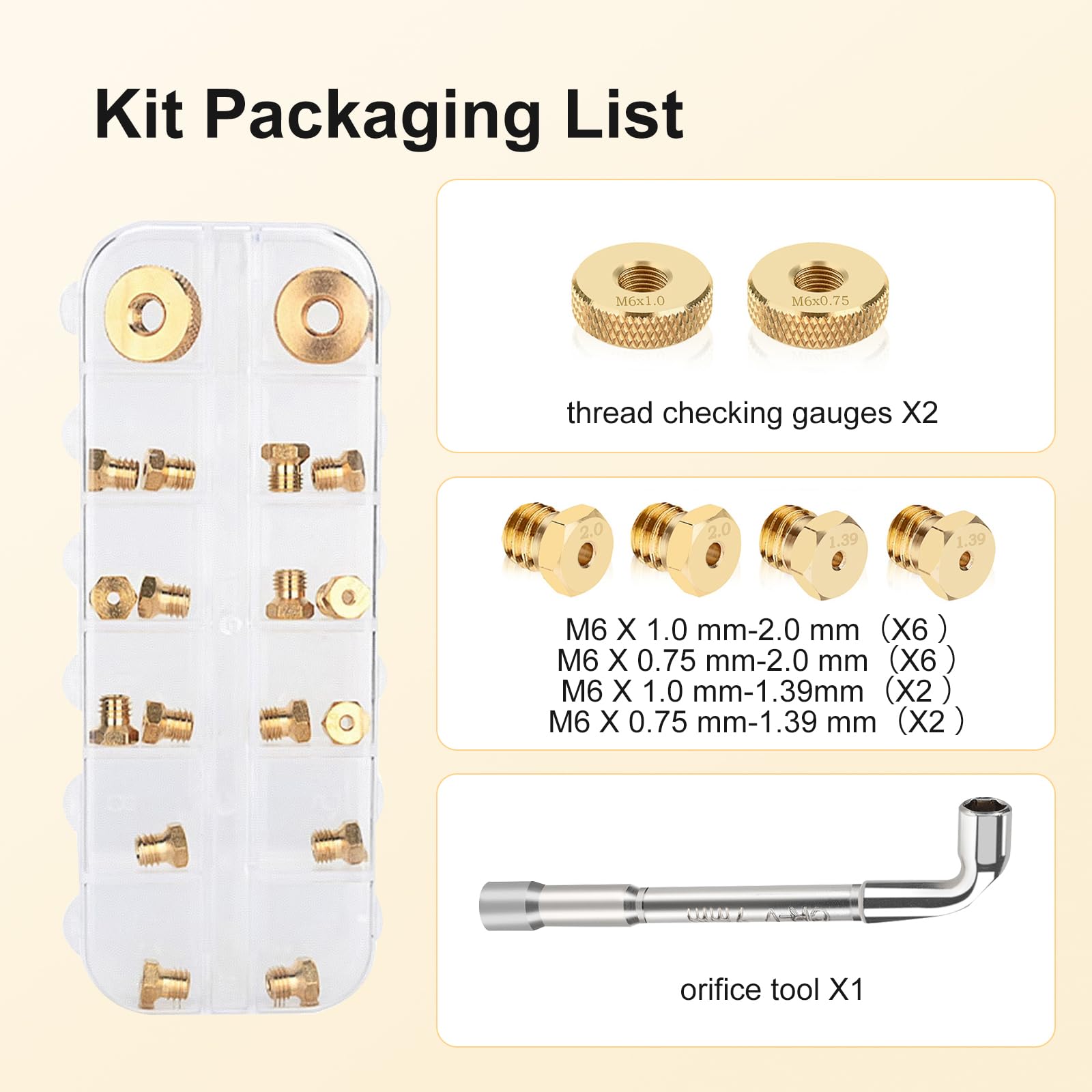 【Packing List】- You will get 1 pcs 3.7mm orifice tool, 2 pcs thread checking gauges and 16 pcs gas nozzle accessories, including: M6 X 1.0 mm-2.0 mm for main burner (6 pcs), M6 X 0.75 mm-2.0 mm for main burner (6 pcs), M6 X 1.0 mm-1.39 mm for side burner (2 pcs), M6 X 0.75 mm-1.39 mm for side burner (2 pcs).