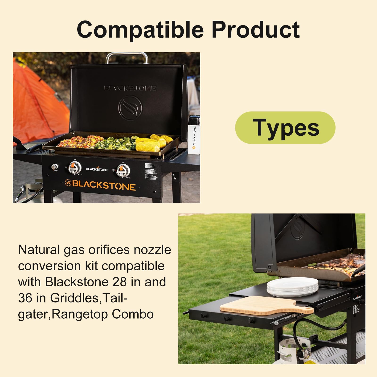 【Compatibility】- The Natural Gas Nozzle Conversion Kit converts Blackstone 28-inch and 36-inch grills from liquefied propane gas to natural gas, eliminating your concerns about running out of propane. If your grill model is a Rangetop Combo, Tailgater & Single Burner Rec Stove, please double-check that the model fits the nozzle size of this conversion kit. Please note that it does not apply to the Blackstone AirFryer Griddle Combo!