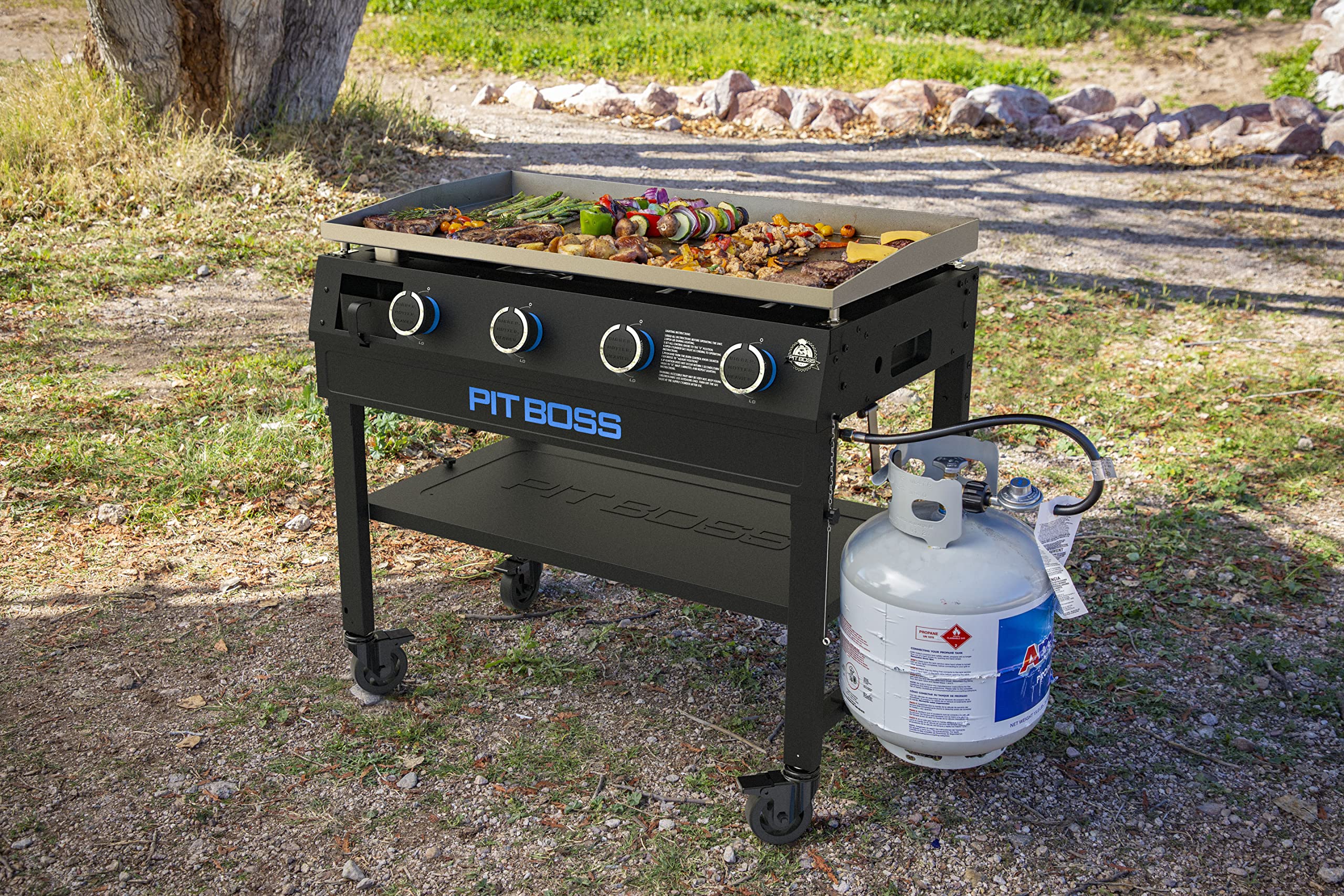 Meet the new lineup of Pit Boss® Standard Gas Griddles. Each Pit Boss 4-Burner Gas Griddle is outfitted with a durable cooktop and robust BTU value for an experience that’s Bigger, Hotter, Heavier® than the rest. Enjoy the convenience and versatility of cooking with the Pit Boss 4-Burner Griddle, complete with 753 square inches of cooking space and four separately controlled burners. The folding legs offer a handy fold-and-go design, while the front grease management delivers easy, mess-free clean up. The PB4BGS1 is the perfect cooking appliance to use in your backyard or for outdoor camping trips, and is backed by our best-in-class 2 year warranty