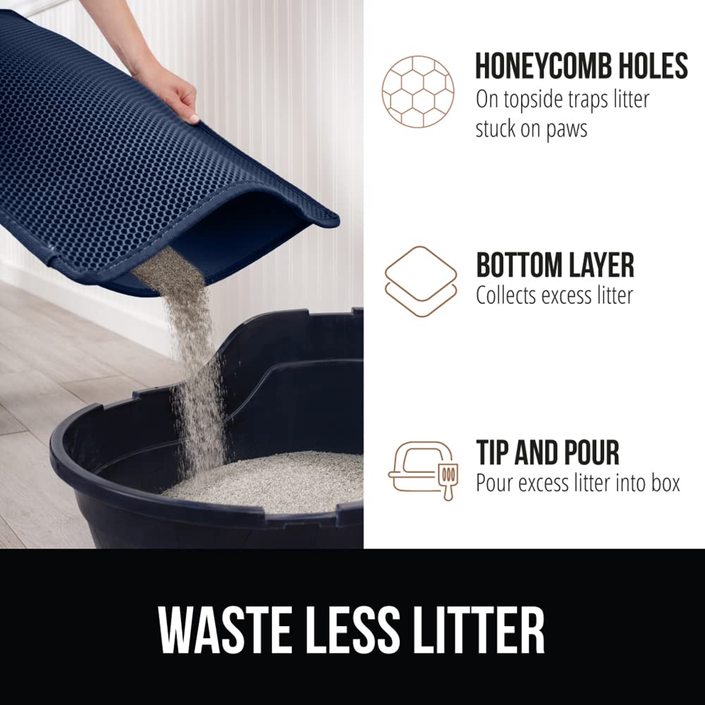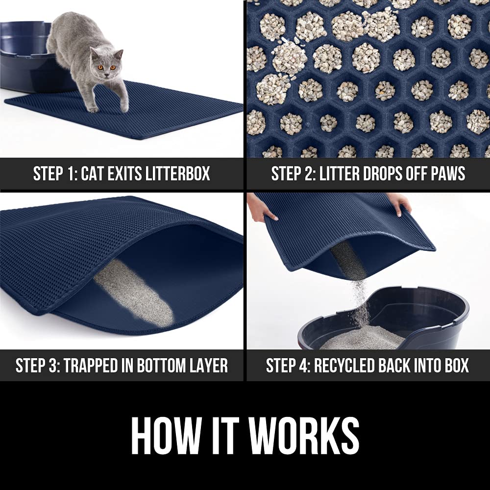TRAPS LITTER: the Gorilla Grip mat traps even more litter as your cat exits the litter box, litter that is stuck to its paws will be captured within the large honeycomb holes on the top layer of the mat; the litter then falls through the holes to become trapped in the bottom, leak proof layer