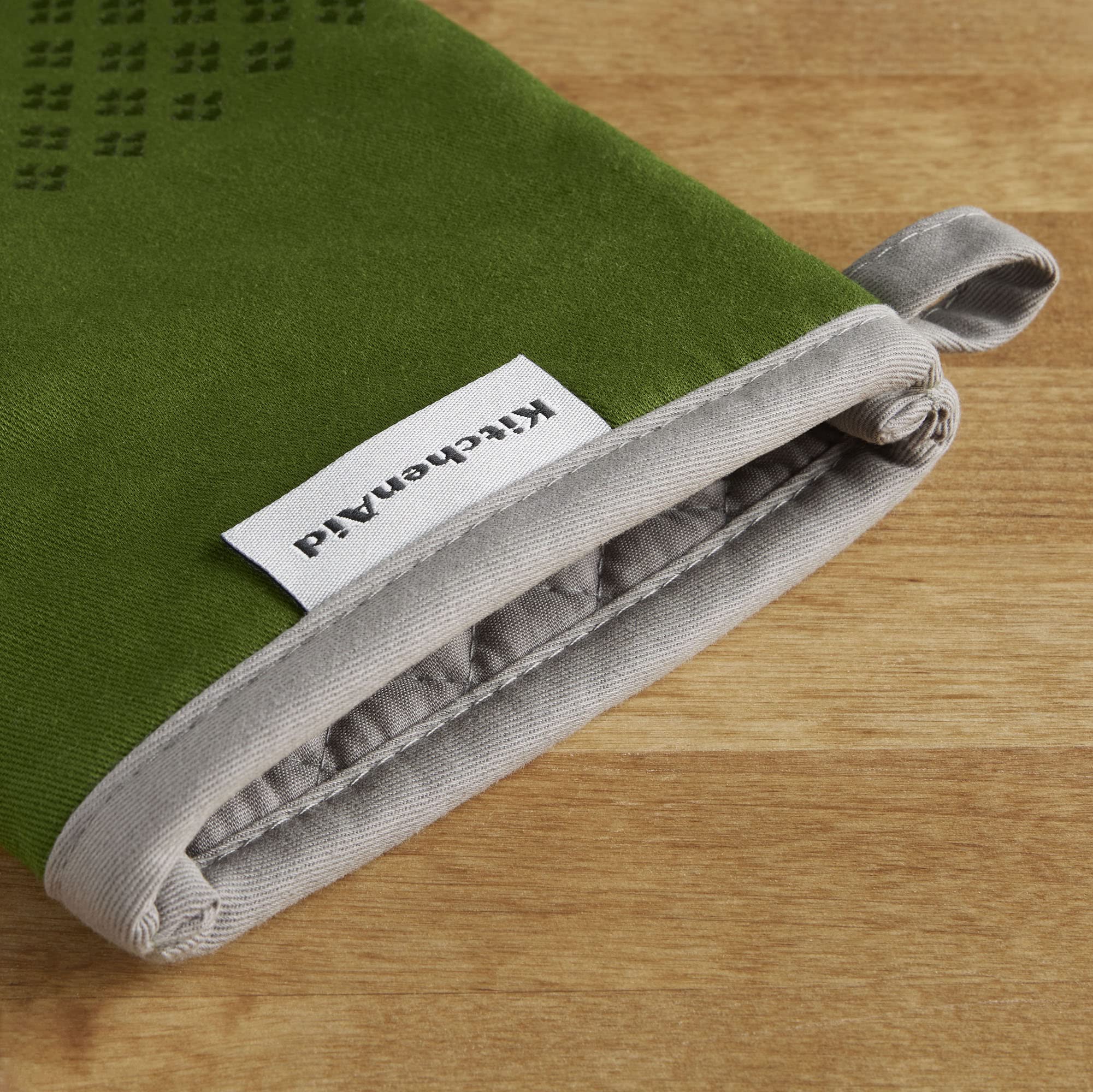 Shield your hands from the heat with the Kitchen Aid Asteroid Oven Mitt 2 Pack. These oven mitts each measure 7 inches wide by 12. 5 inches long for a spacious fit, and they are heat resistant to protect your hands while handling hot pots, pans, and dishes. The heavy-duty, 100 percent cotton fabric on the outside as well as the cotton lining offers comfort, flexibility, and insulation. Textured, silicone print grips on the mitts are heat resistant and also ensure a more firm and secure grip when handling dishes and cookware. The matching oven mitts feature a convenient hanging loop to easily display or store them when not in use. They are easy to clean and machine washable for easy care. Use your Kitchen Aid Asteroid Oven Mitt 2 Pack along with coordinating kitchen accessories from Kitchen Aid including potholders and kitchen towels for a complete set of Kitchen Aid kitchen essentials! Each item is sold separately. Perfect for cooking and baking. Give the Kitchen Aid Asteroid Oven Mitts as a gift to a friend or family housewarming, on holidays or any special occasion. Made in China.