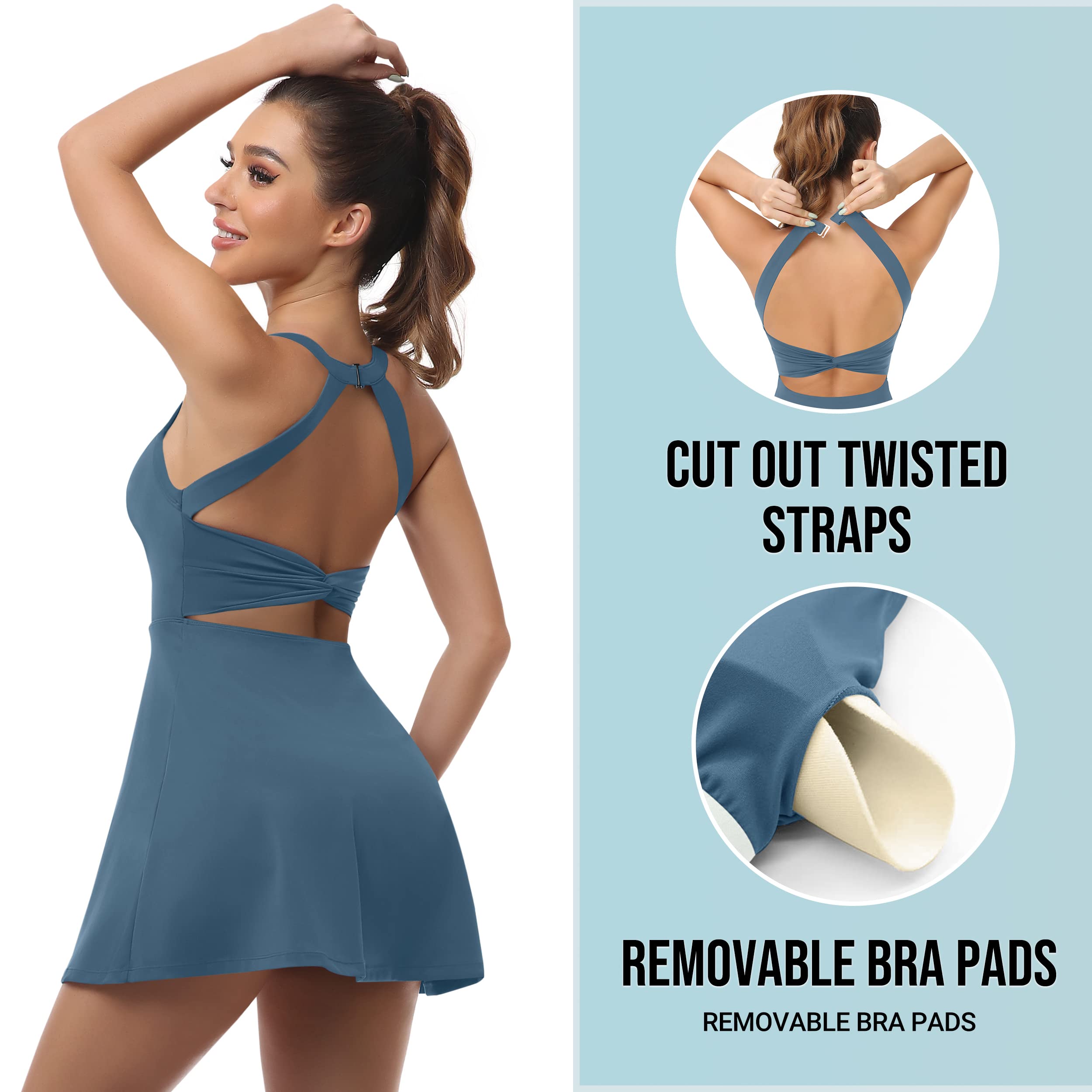 Back design: It is designed with a fabric twisted feature at the back, which adds more fashion factor to this dress. The cut-out design creates a breezy feel with more cooling when you do exercise. At the back of the neck, We have designed a detachable buckle design, which is convenient for users to put on and take off.