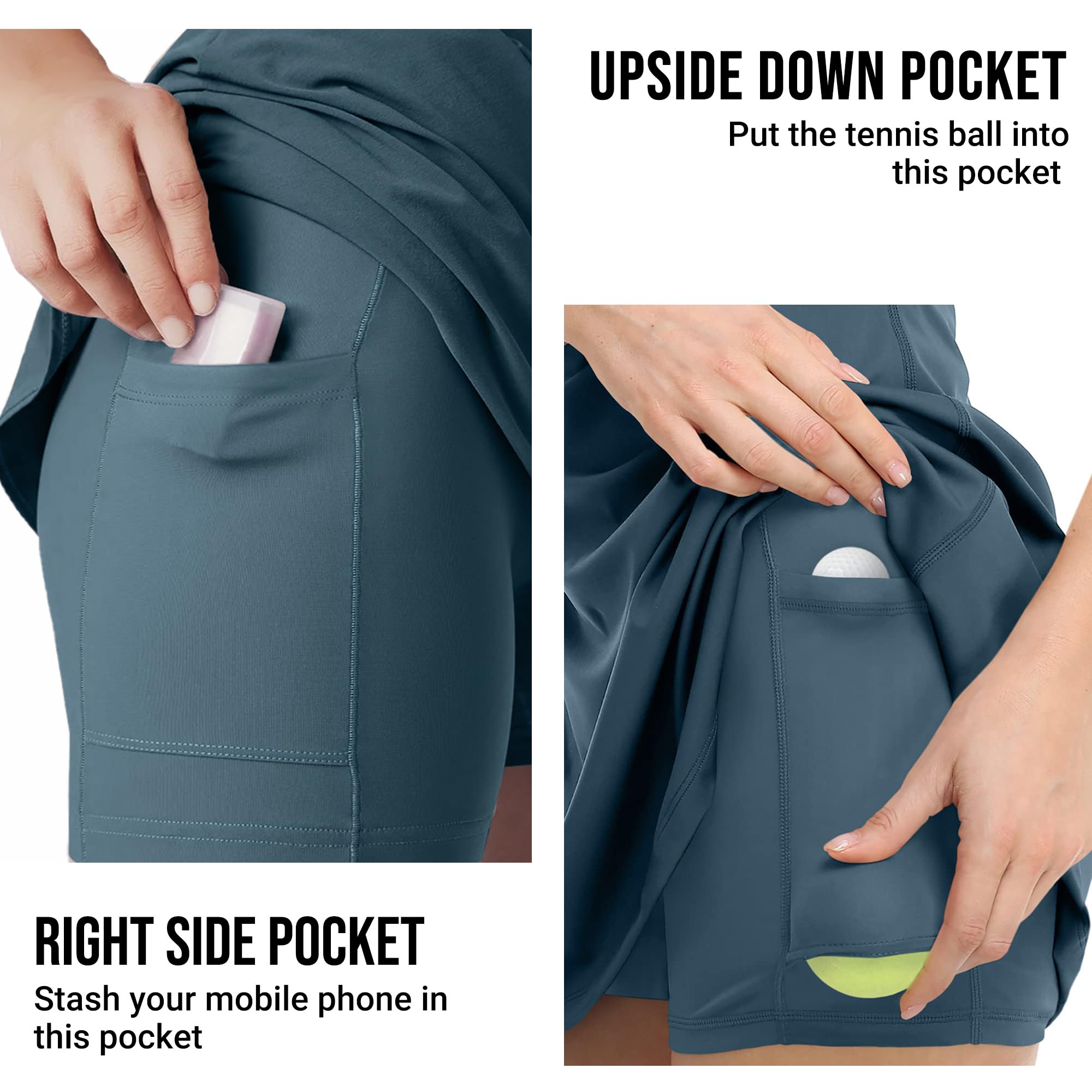 Three Pockets: To provide more convenience for users, we design three pockets for storing essentials such as credit cards or other small items when you're on the go. The left two pockets can stash the tennis ball, you can store the ball from the upper or lower pockets according to your preference. The right pocket can store the mobile phone. Moreover, we have designed a function to put the golf tee in your out layer of right pockets, you can wear this dress for golf activities.