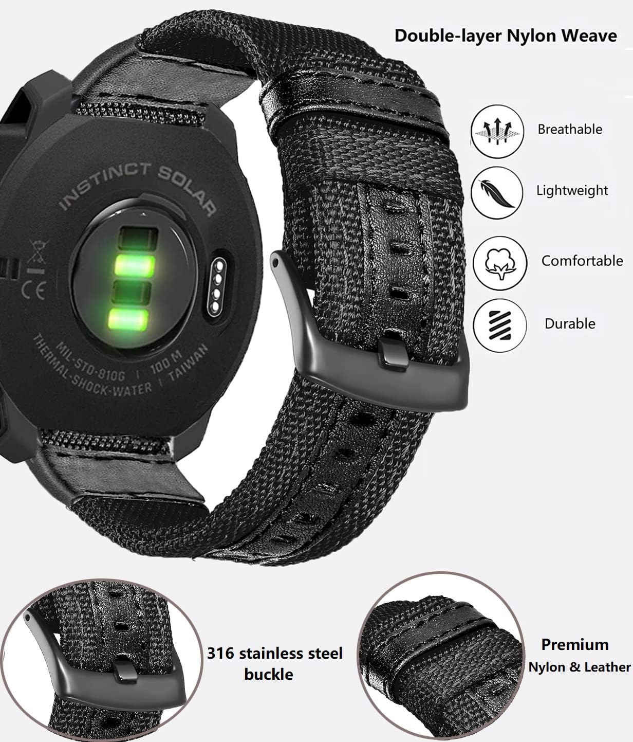 ⌚【Durable Instinct Watch Bands】Premium Garmin Instinct nylon watch strap is made of high-quality durable fabric breathable nylon canvas, sweat-resistant, without skin irritation. Classic colors and integrate with premium leather to change the style of your Garmin Instinct 2 Tactical. Suitable for daily work and exercise, air holes design make it lightweight and breathable, adding a touch of bright color to physical training.