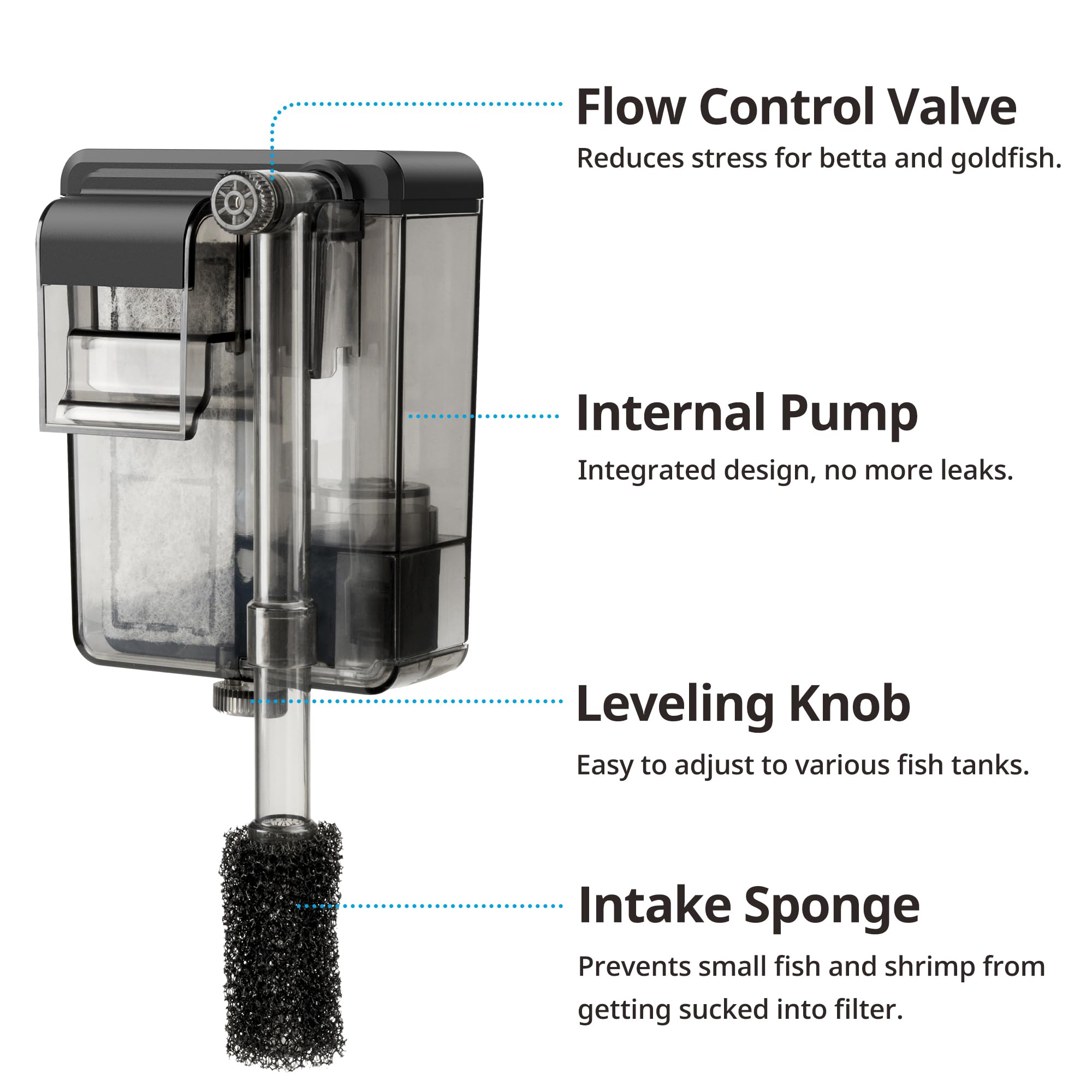 Quiet operation with adjustable flow, doesn't overly disturb the fauna, perfect for shrimp or betta.