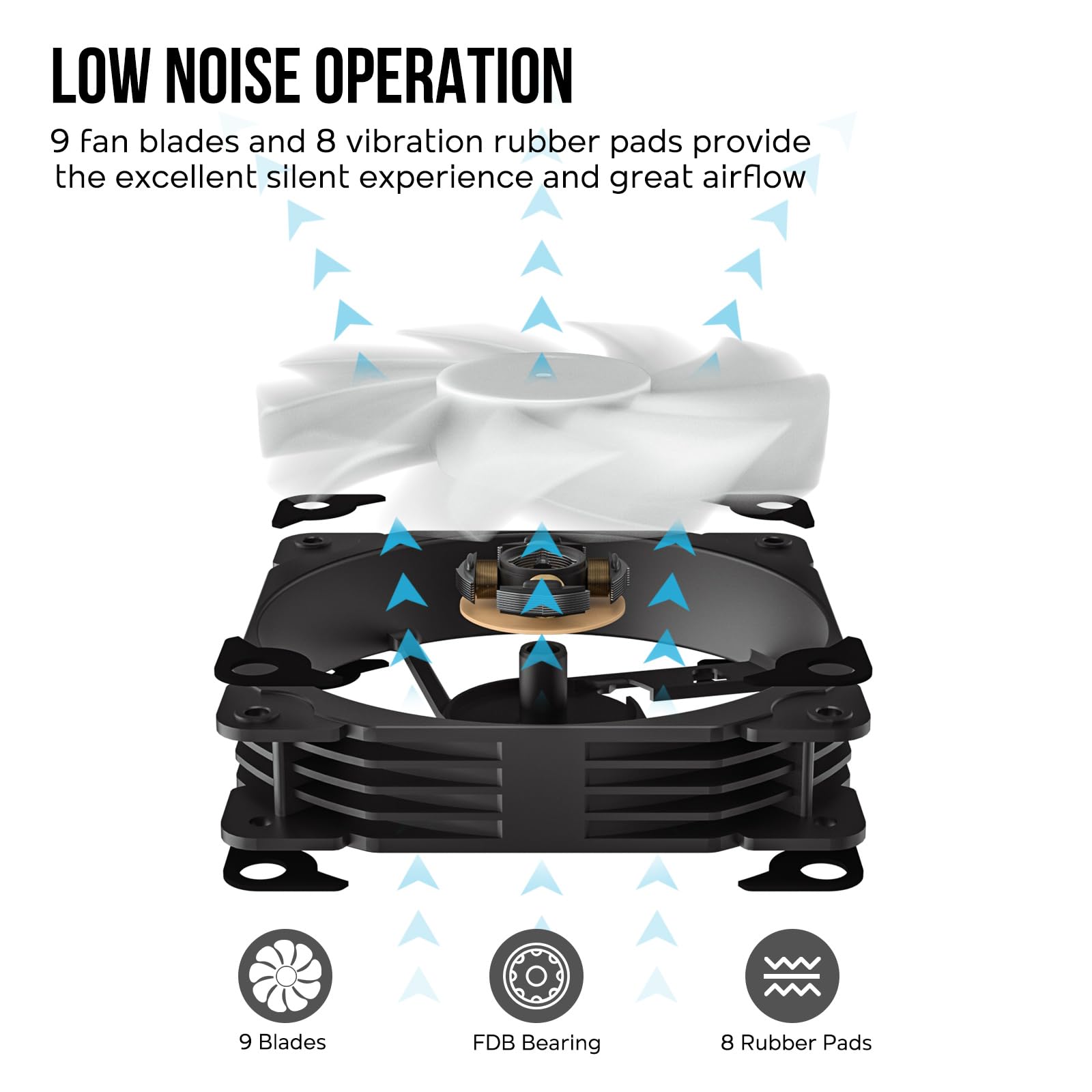 Low Noise Operation: Nine fan blades and eight vibration rubber pads provide the better silent experience and great airflow for the case and components