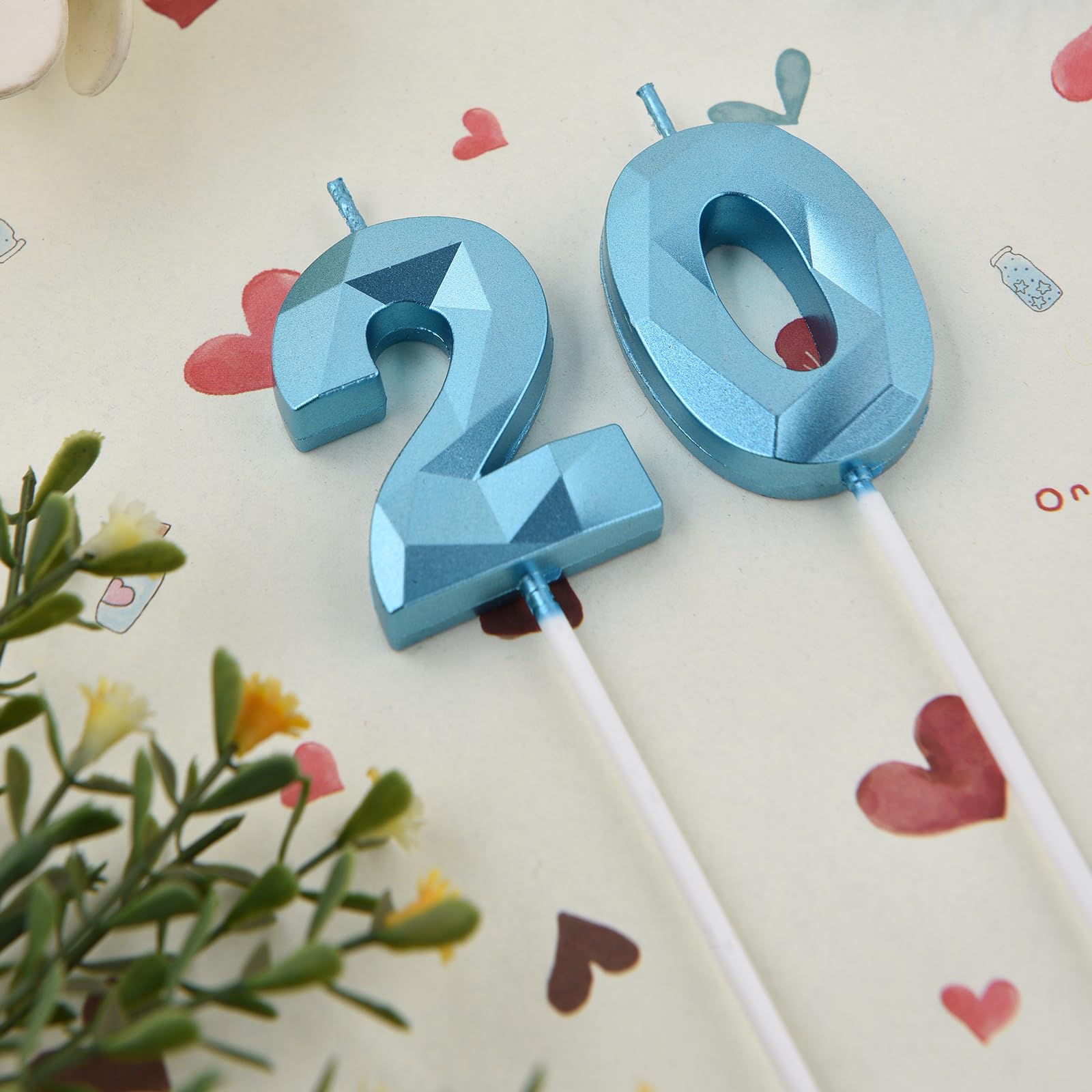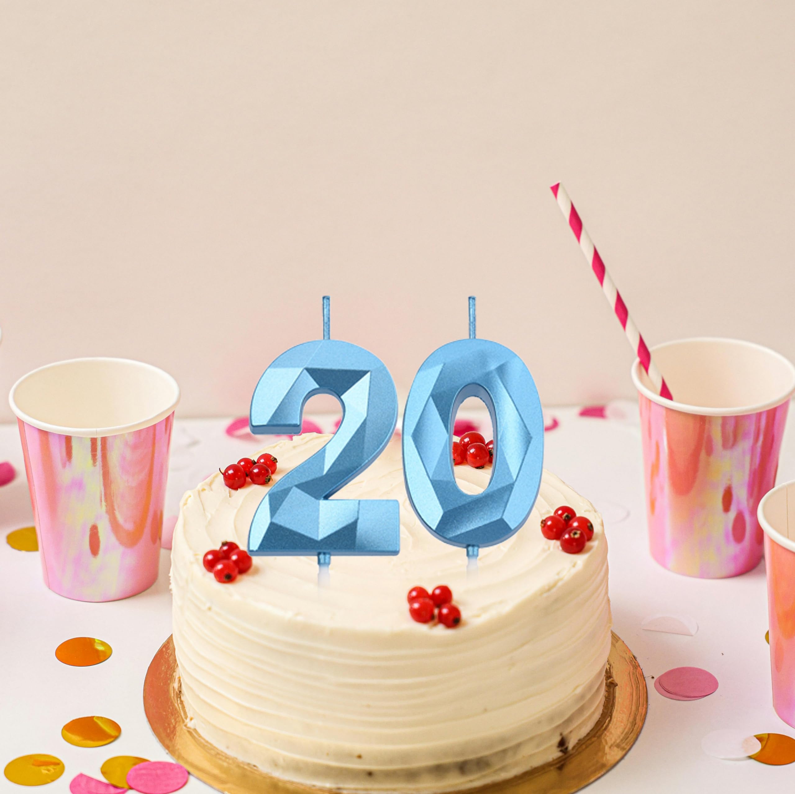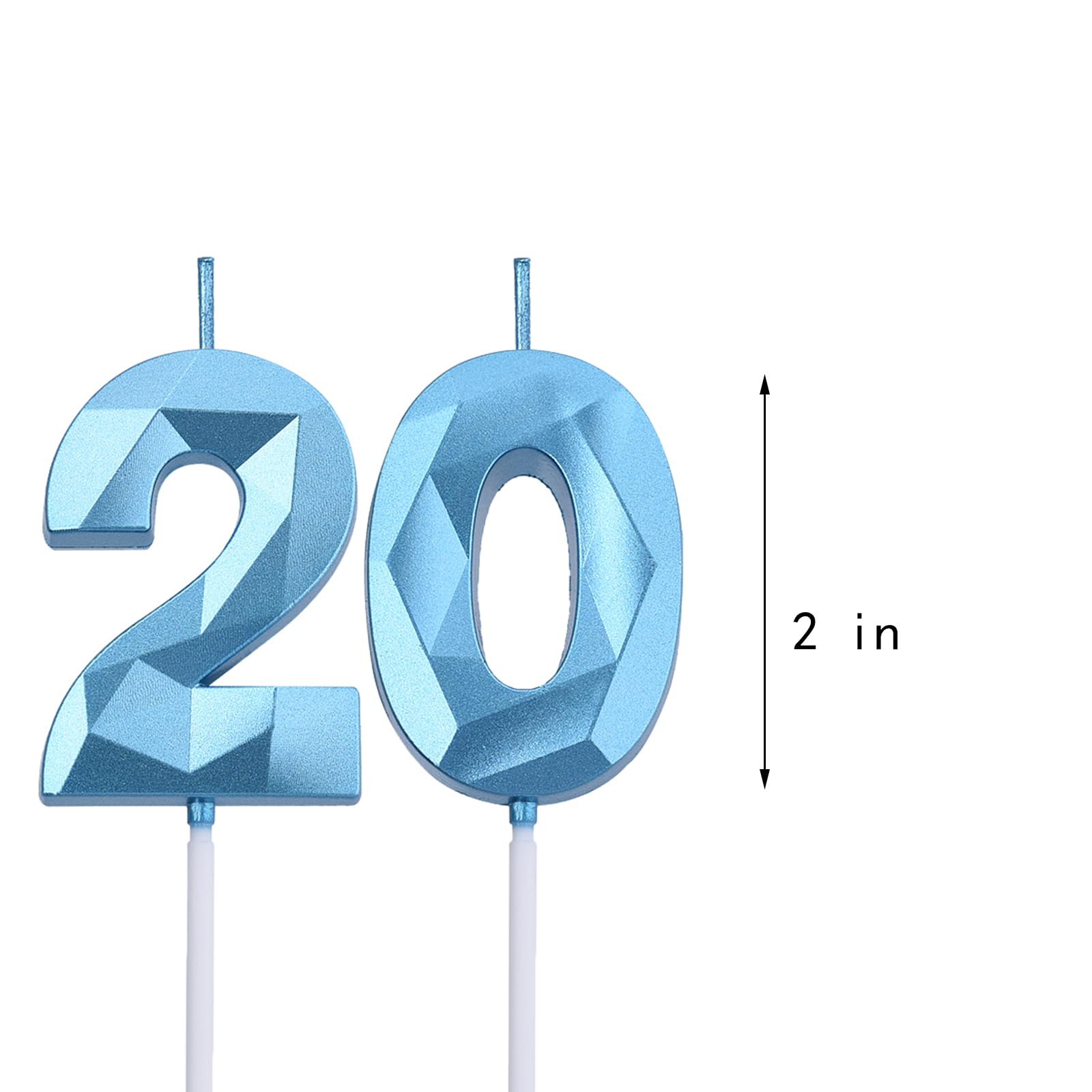 INSTRUCTIONS: Package Include: 2 pcs candles,Number 20 birthday candles Color : Glitter Blue Material : quality wax ,smokeless and non-toxic Size: Width:1.4 in. Number height: 1.97 in. Total height: 4.9 in Please Note : Warm Note:Please keep the candles in shade away from the fire