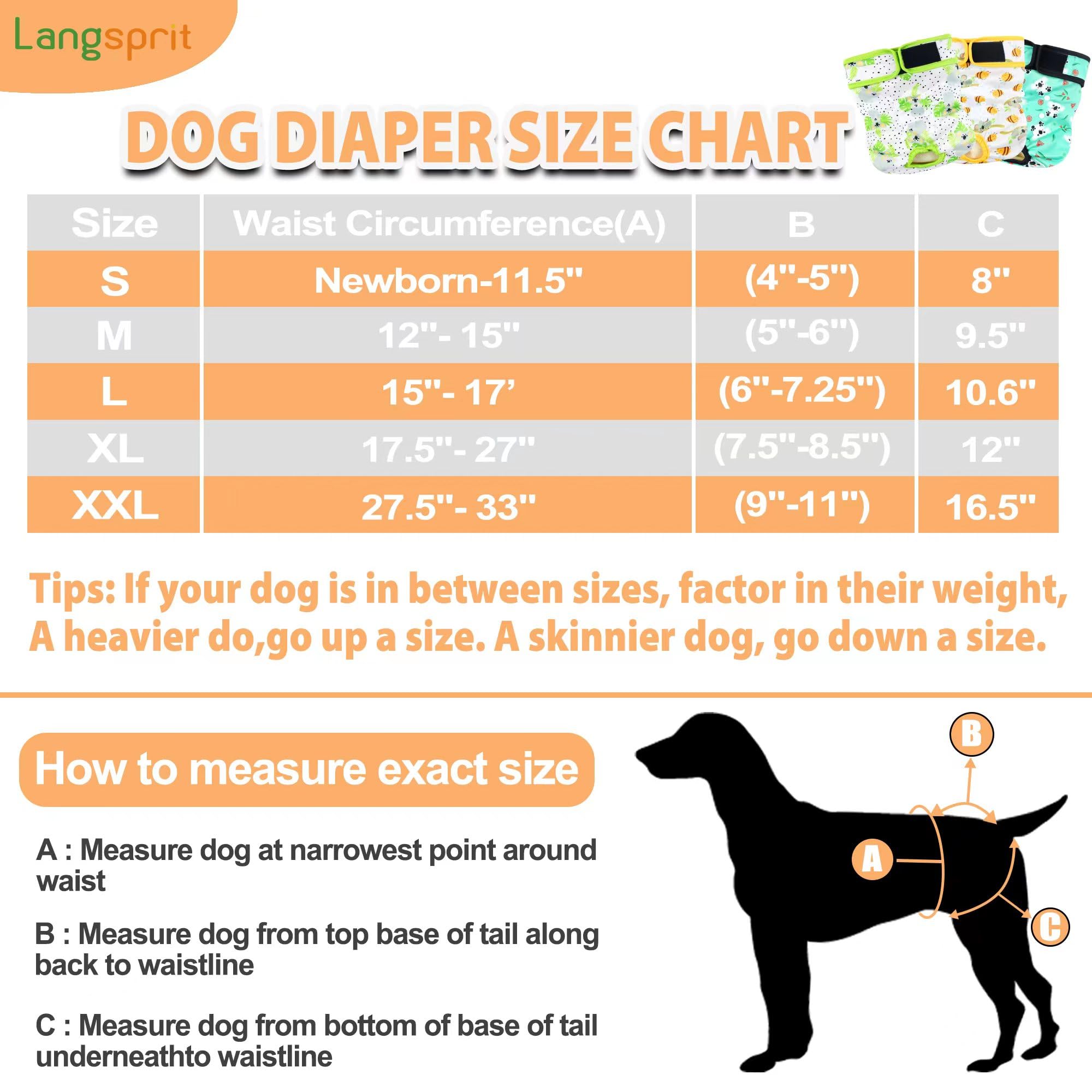 Sizing - The 3 Pack of Female Dog Diapers come in S, M, L, XL and XXL. Measure dog's waist and check the size chart before make an order is a great way to get the correct size. If your dog is in between sizes, factor in their weight, A heavier dog go up a size. A skinnier dog go down a size. The hook&loop closures of diaper provide a wide range of adjust.