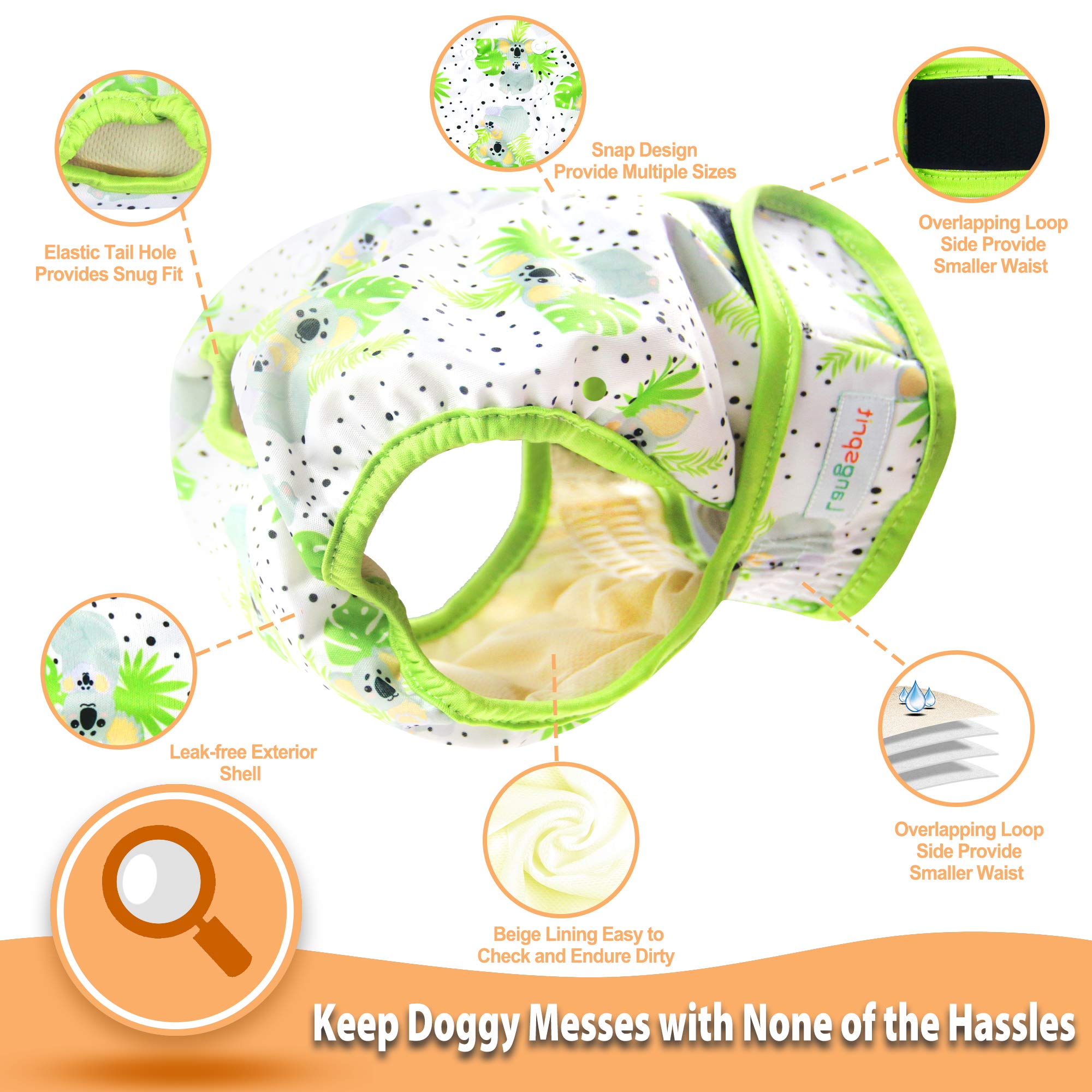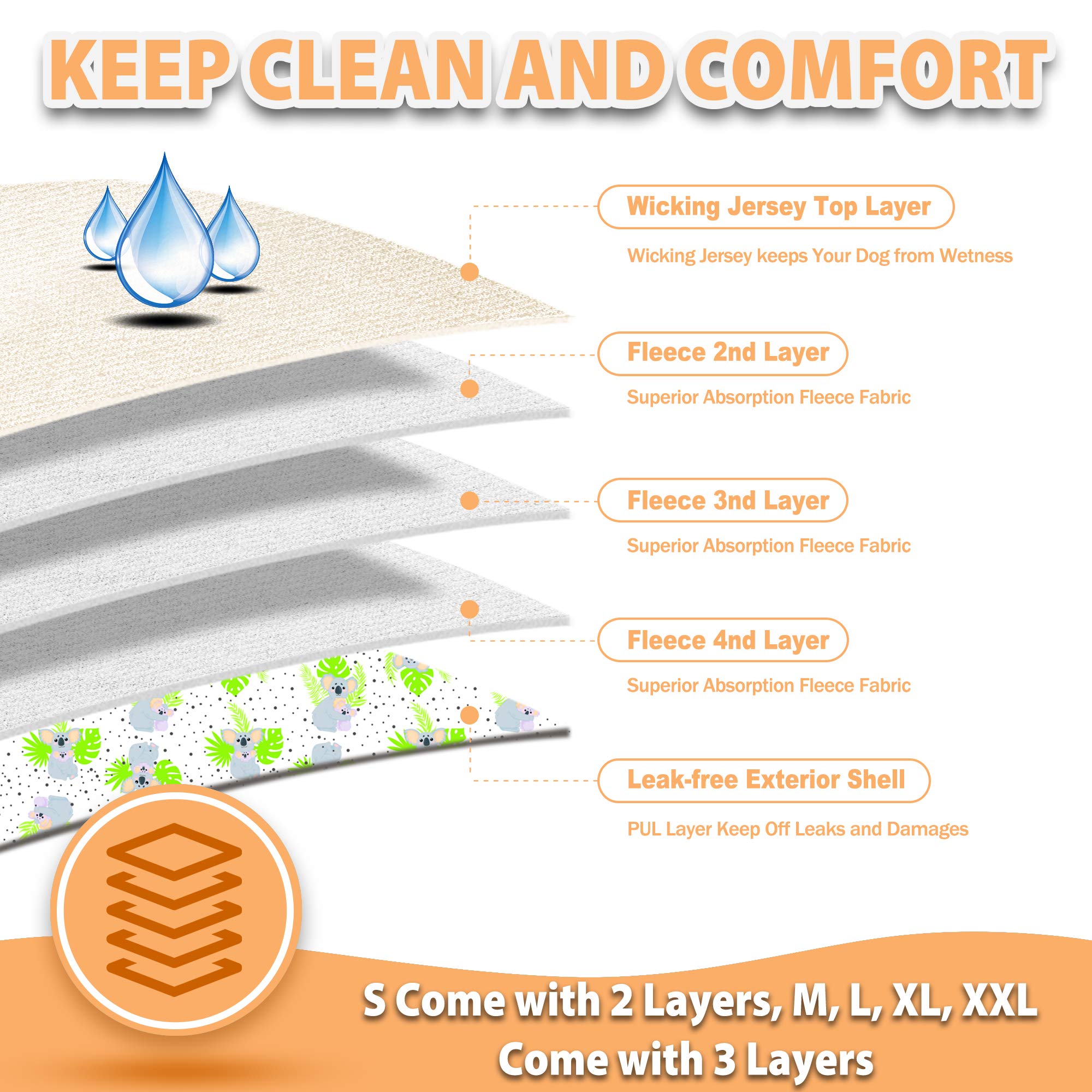 Absorbent & Leak-free Materials - The reusable female dog diaper inner layer is made of soft and breathable beige color wicking jersey, perfect to keep the dog from wetness. The 3 middle layers are made of highly absorbent fleece to absorb the liquid and stop any leaks.The diaper outer layer, with attractive and fun designs, is made of smooth and soft-to-touch leak-free TPU material to keep the floor or bed dry and clean.