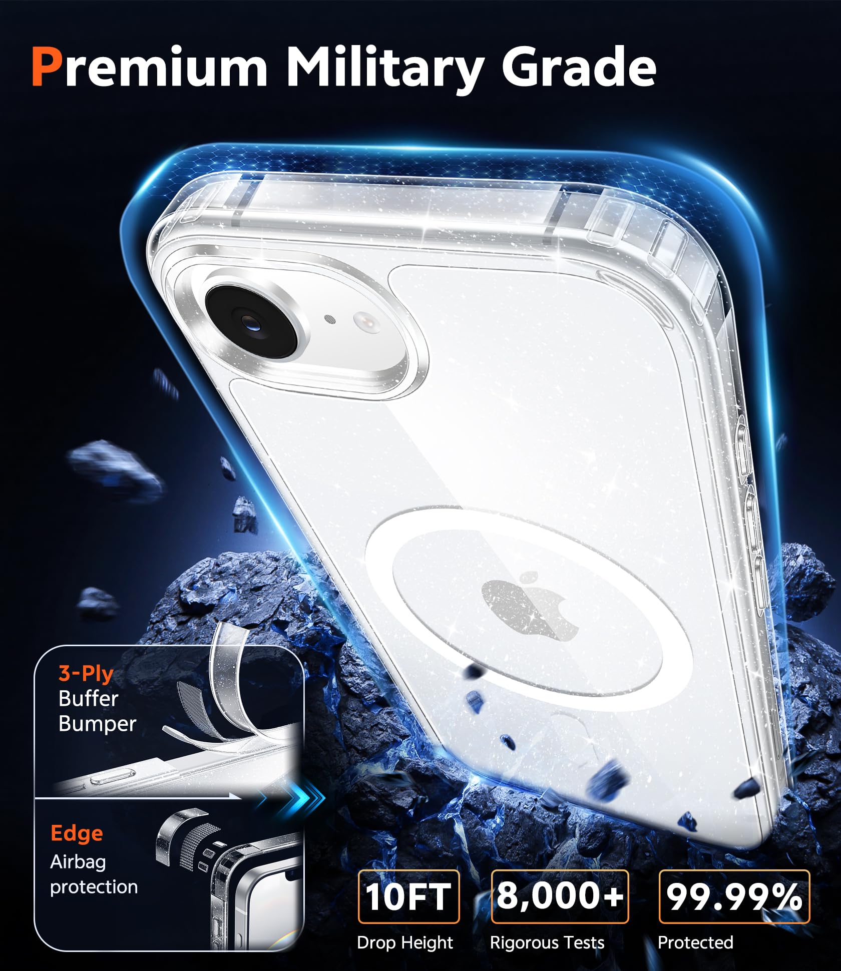 10FT Military Grade Protection: Passed Military Drop Tested up to 10 FT. This iPhone 17e/16e clear case backplane is made with rigid polycarbonate and flexible shockproof TPU bumpers around the edge and features 4 built-in corner Airbags to absorb impact, which can prevent your Phone from accidental drops, bumps, and scratches