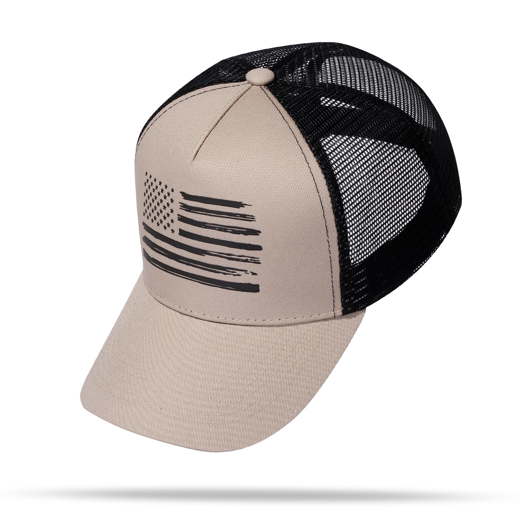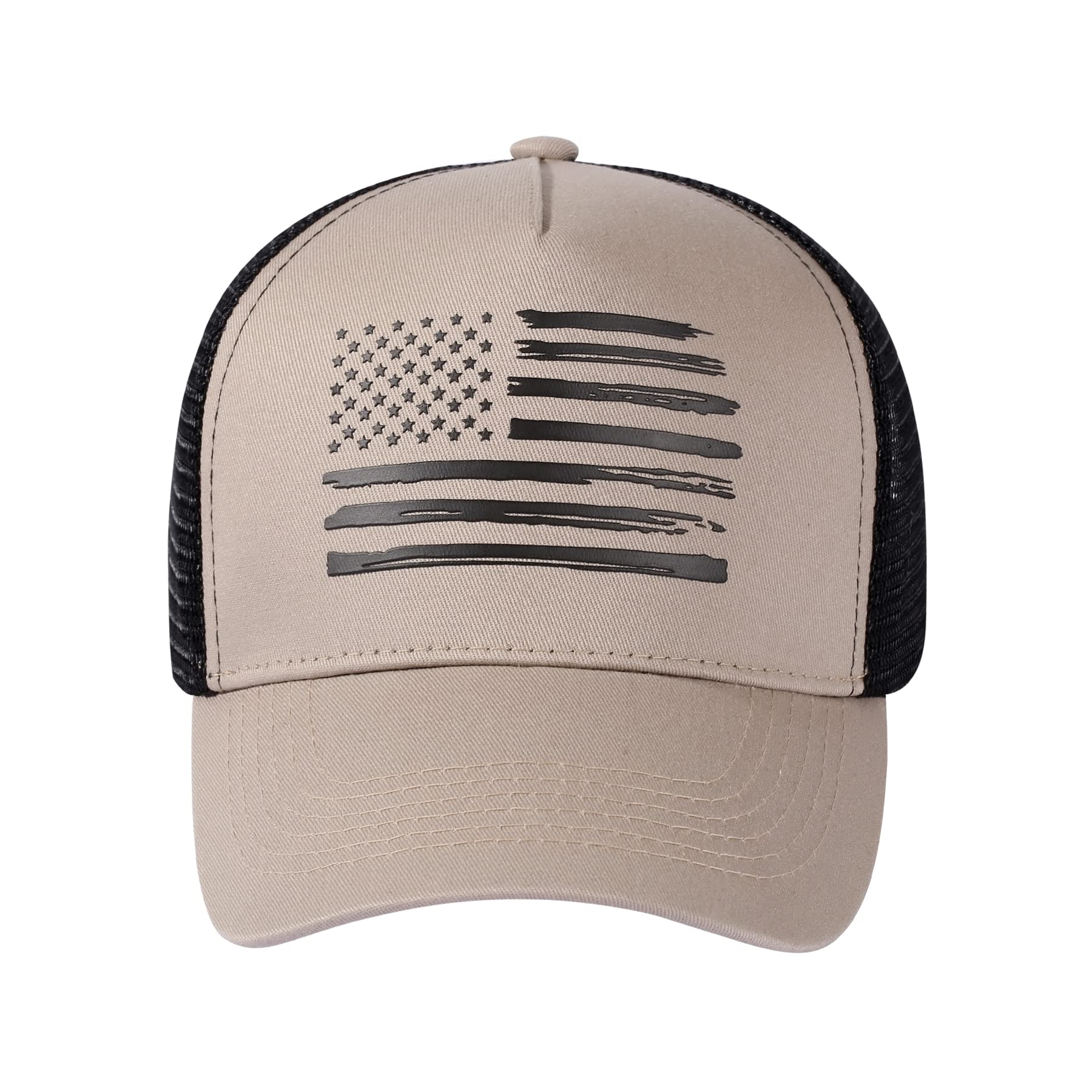 Versatile Style: Classic 5-panel trucker hat design, boasts precision - stitched seams that enhance its a well - contoured brim that retains its shape. Features a stylish distressed American flag graphic printed on the front panel, showcases the unique design of the baseball cap