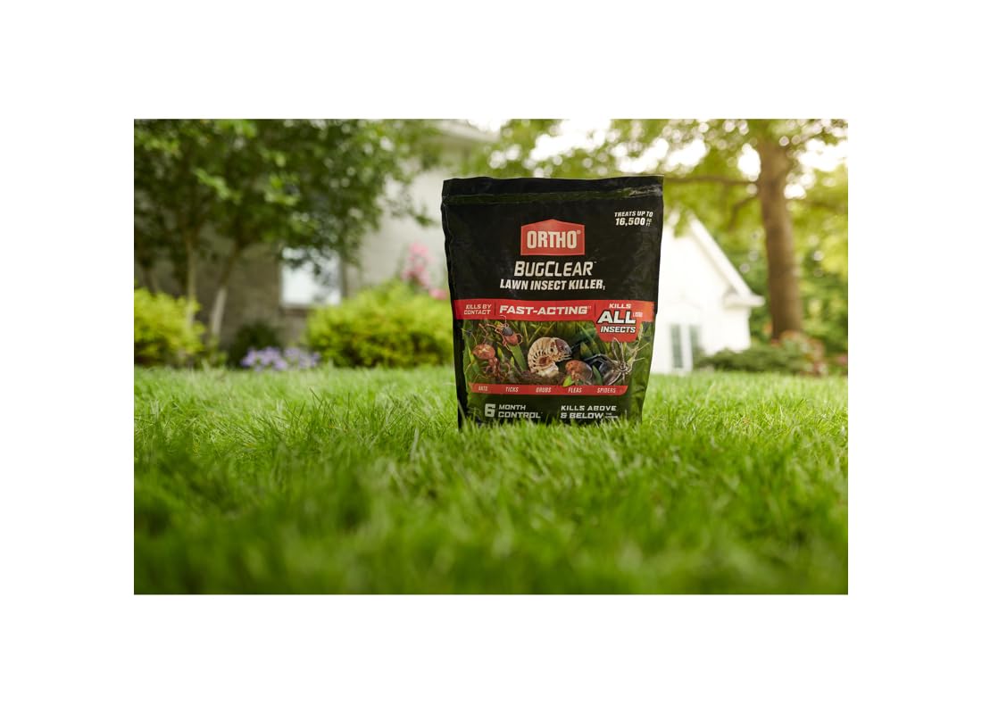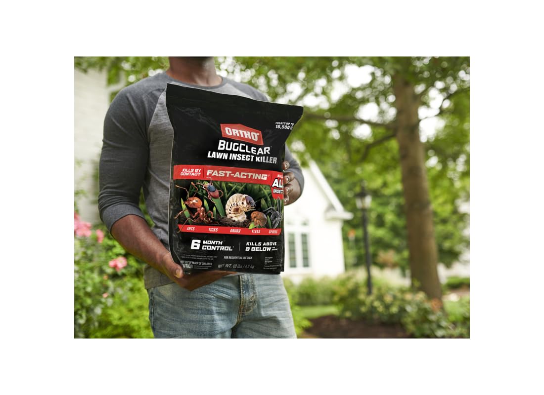 Protect your backyard and enjoy your lawn with Ortho® BugClear™ Lawn Insect Killer1 Granules. The fast-acting insect killer starts to work in minutes* and kills by contact to protect against all listed insects including ants, spiders, fleas, ticks, armyworms and grubs. This pest control product works above and below the ground to kill insects, and creates a long-lasting bug barrier for up to 6-months of ant control** and 3 months of residual protection against spiders, ticks, beetles, and other listed insects***. Use on your lawn, ornamentals, home perimeter, vegetable garden and flower beds to protect against pesky insects, killing them outside before they come inside***. Apply this yard bug killer early in the spring before infestation or whenever insect activity or damage is first observed. For best results, apply with a Scotts® spreader and then immediately water in granules. People and pets may re-enter treated areas once dry. One 10 lb. bag of Ortho® BugClear™ Lawn Insect Killer1 Granules treats up to 16,500 sq. ft. *except against fire ants **excludes carpenter, pharaoh and harvester ants ***see product label for full list