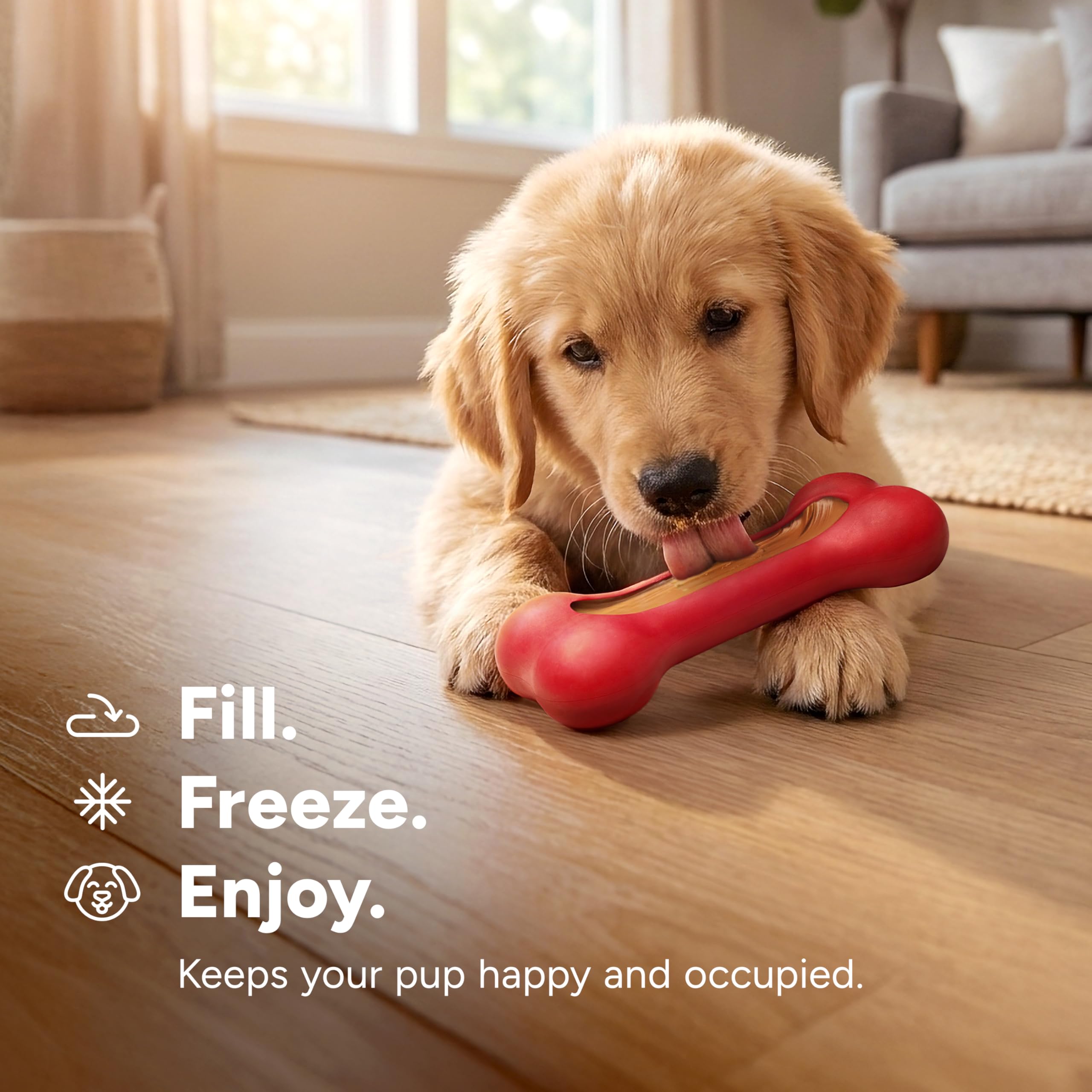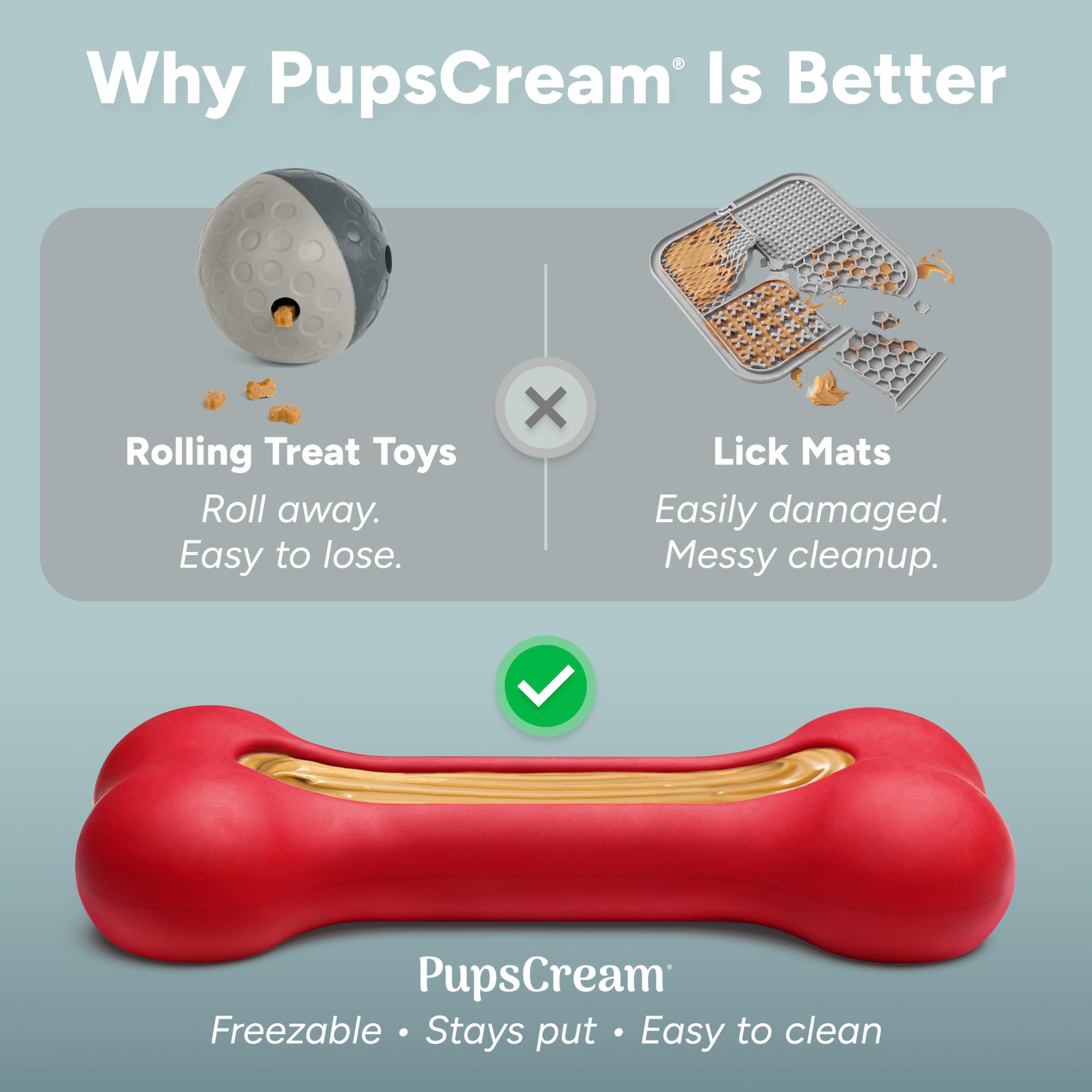 Give your dog a healthy treat with PupsCream! This premium, freezable dog treat holder keeps your dog happy, calm, and engaged. Fill it with various dog-friendly snacks like broth, yogurt, or peanut butter, and then freeze the bone for a long-lasting treat to keep your dog busy. Unlike traditional fillable treat toys that move or bounce around, the PupsCream sits flat and grips the ground, keeping your dog occupied in one place to prevent messes around your home. This 7-inch treat holder can hold up to 1.75 ounces of filling and is great for small and large dogs. Cleaning is a breeze, PupsCream is dishwasher safe (top rack) or can be washed by hand. Made from food-safe natural rubber, PupsCream offers a durable and safe option for rewarding your dog with tasty frozen treats!