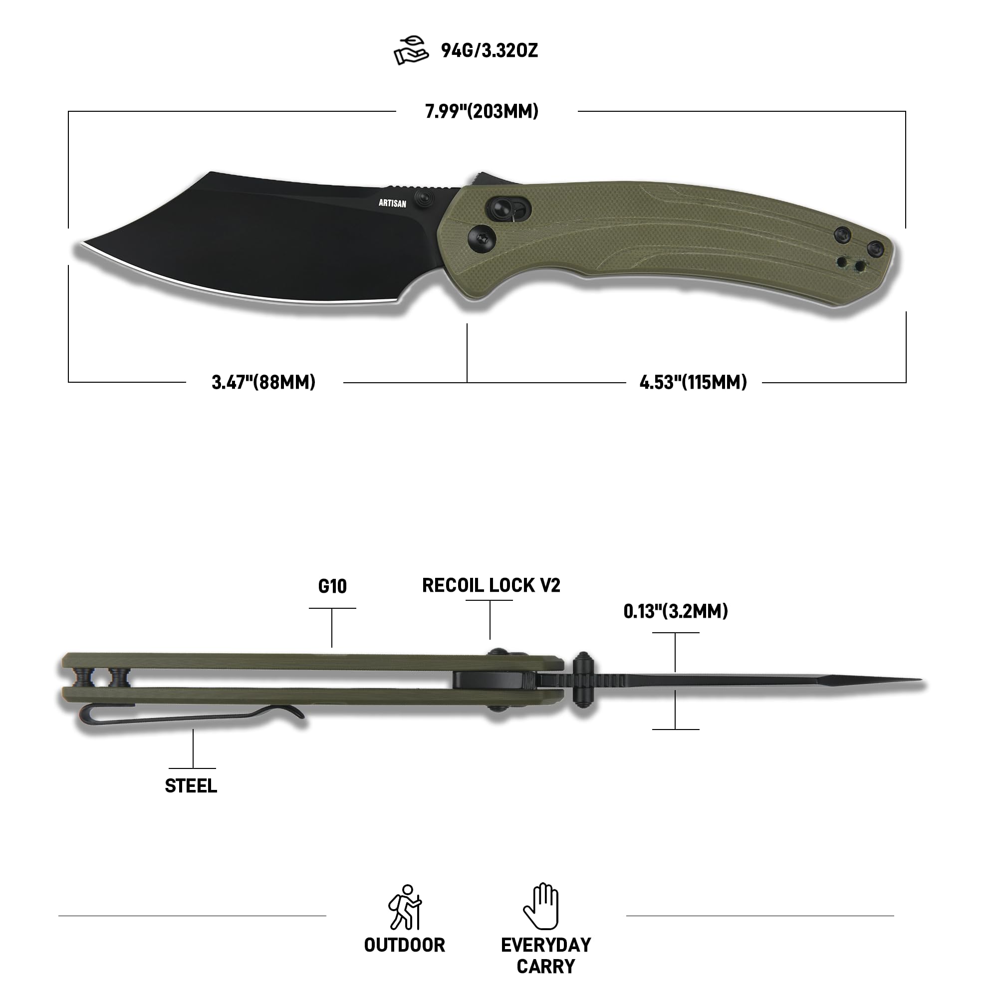 Compact and Lightweight: Weighing 94g/3.32oz with a closed length of 4.53 inches, this folding knife includes a steel clip for convenient everyday carry, keeping it ready for use whenever needed