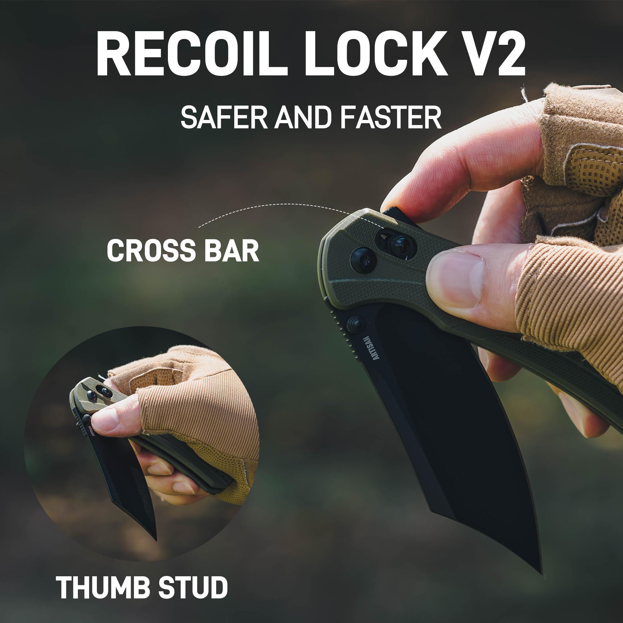 Upgraded Recoil Lock V2: The improved Recoil Lock offers the strength and stability of a crossbar lock. External fins allow smooth action, and the ceramic ball-bearing pivot ensures consistent, controlled blade movement