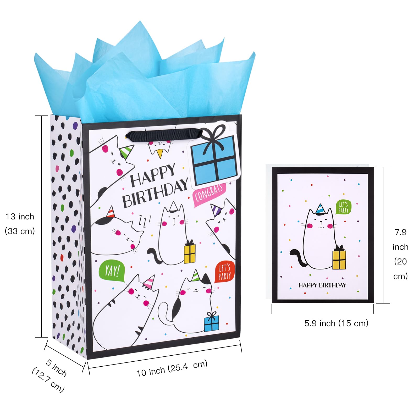 PACKAGE & SIZE: The package includes 1 gift bag + 1 greeting card + 1 gift tag + 2 tissue paper. The gift bag measure 13" Wide x 10" High x 5" Deep. The appropriate size can hold a lot of things STRONG & PREMIUM QUALITY: WRAPAHOLIC gift bags are all made with superior quality. Every part of the bag is well-made using heavy duty glue, making them sturdy and reliable for every packing need. UNIQUE LOOKING: Adorable cats and "happy birthday" lettering are printed. Its stylish design is guaranteed to make your merchandise and gifts stand out from the crowd. SUPER CONVENIENT:It is convenient to use with handle design. The gift bag is perfect for craft and DIY, you can decorate it with beautiful ribbons. USE ALL OCCASION: Our excellent WRAPAHOLIC gift bags perfect for Birthday gift bag, party favor bag, celebration gift bag or other important occasions. QUALITY CUSTOMER SERVICE: Any question about products or orders, please feel free to contact the customer service, we will try our best to solve the problem.