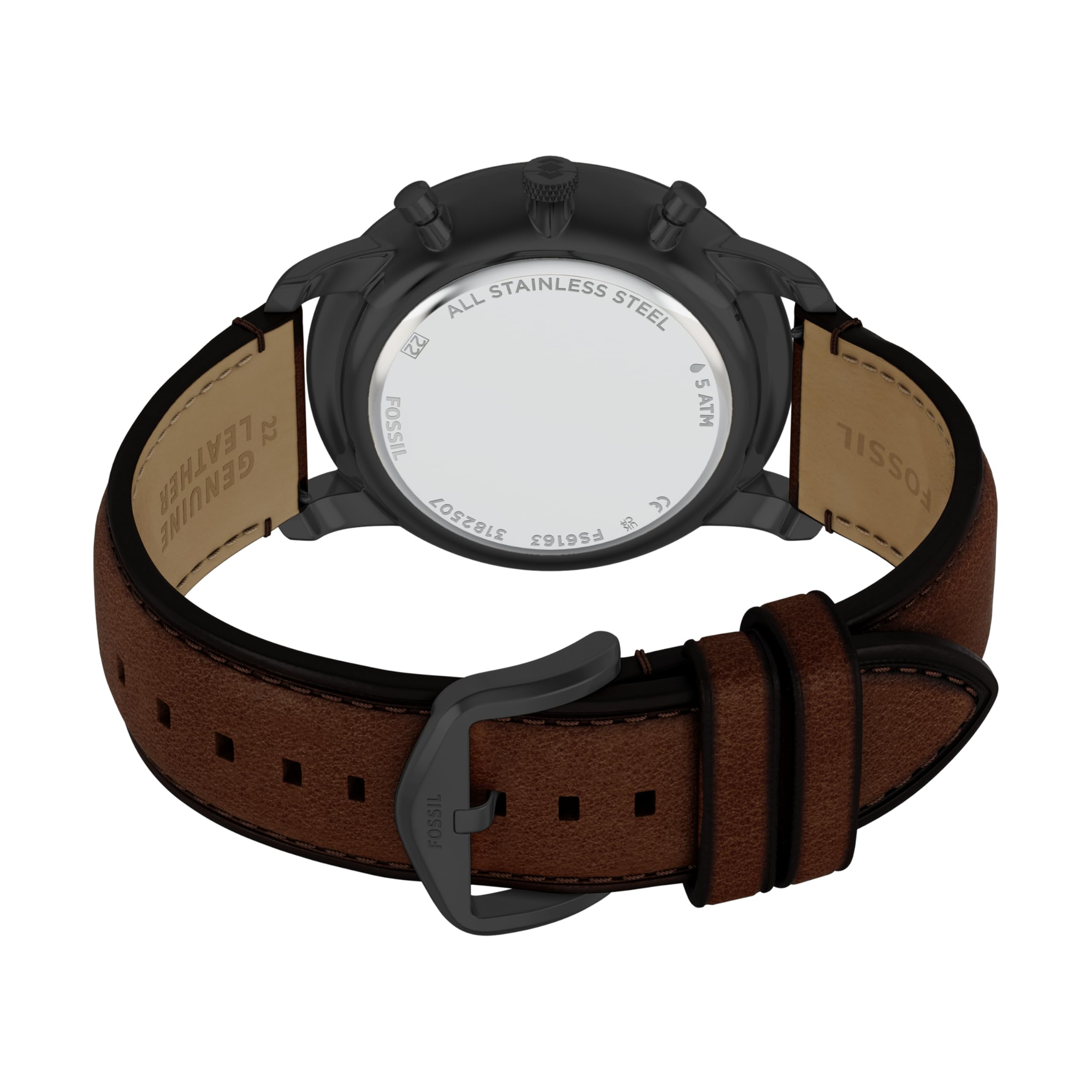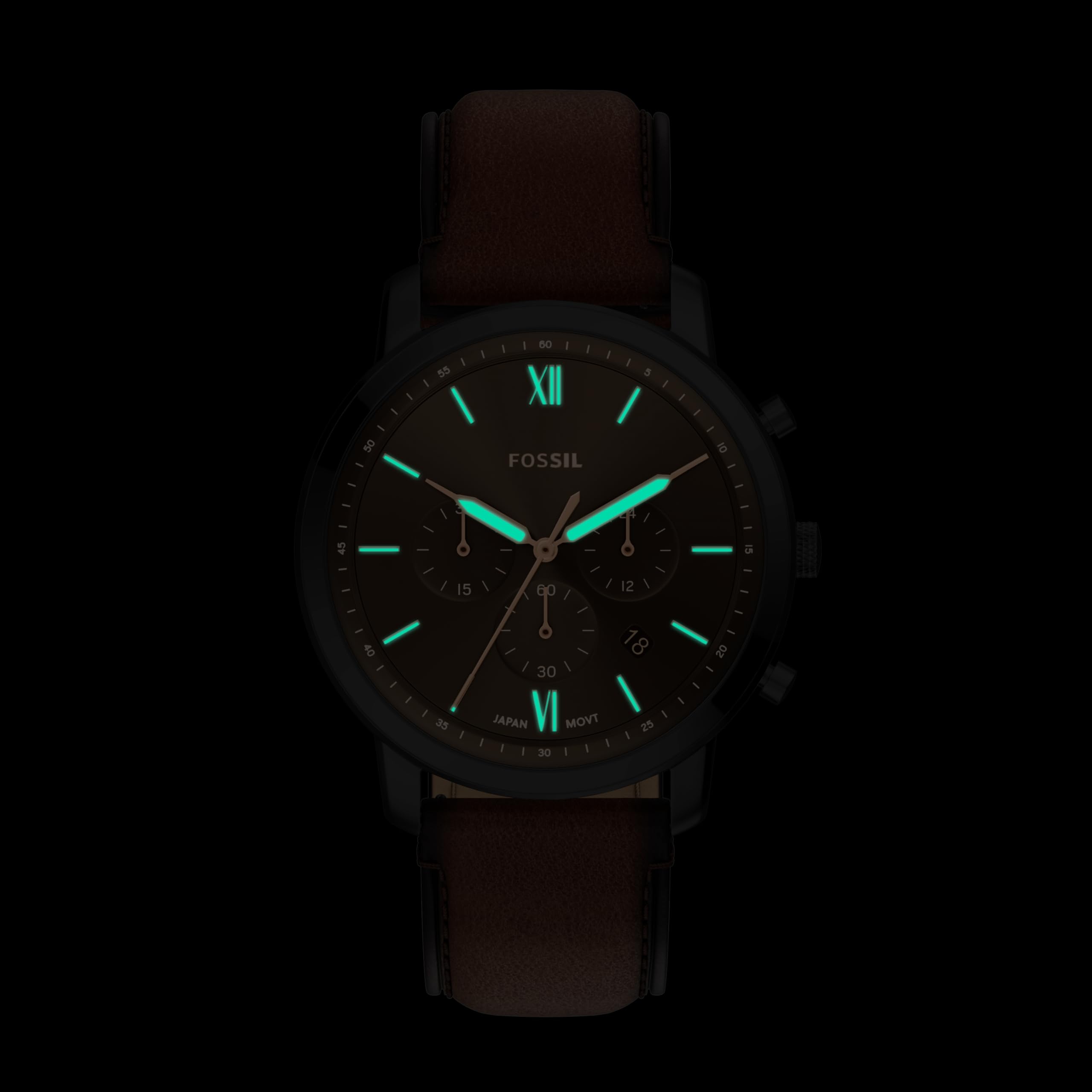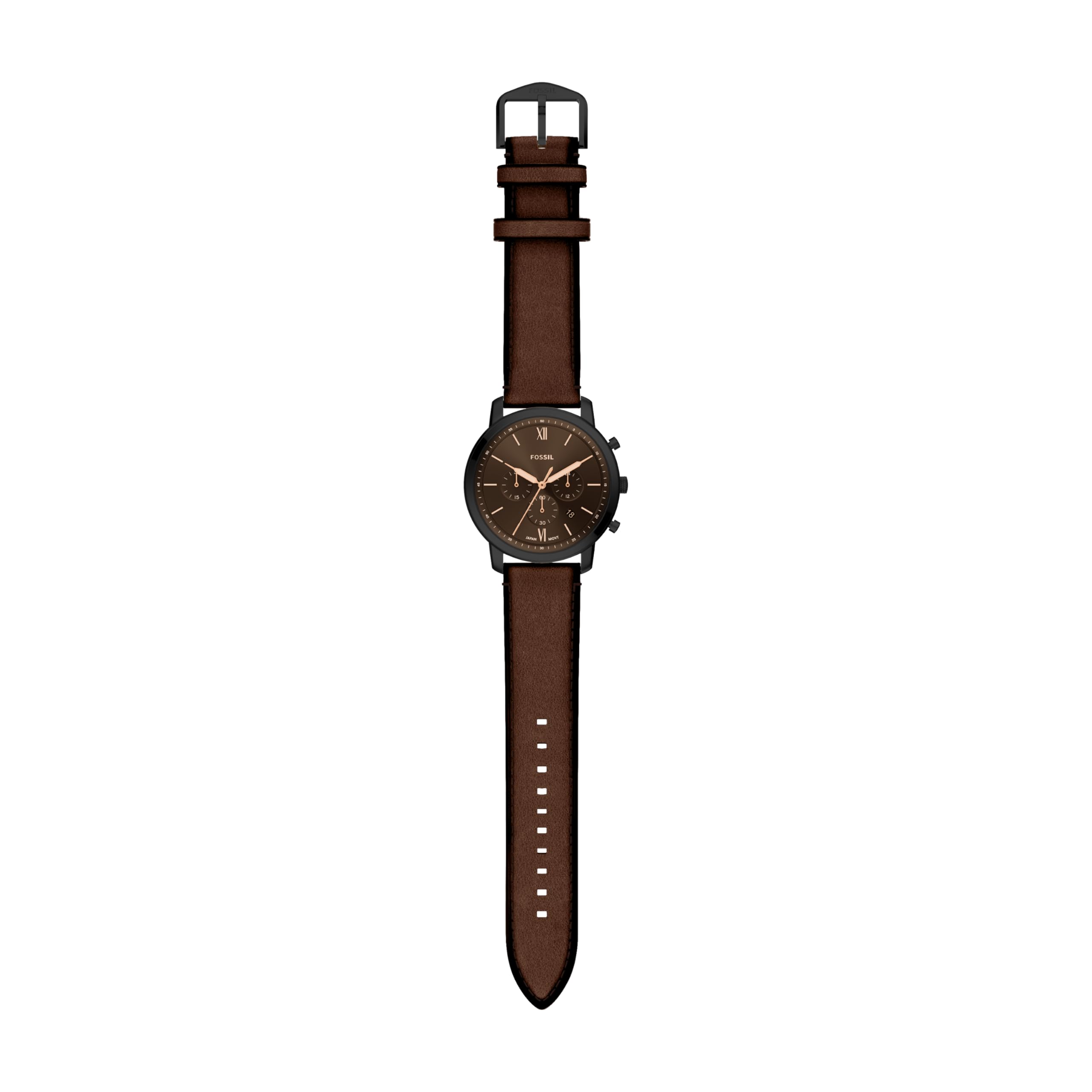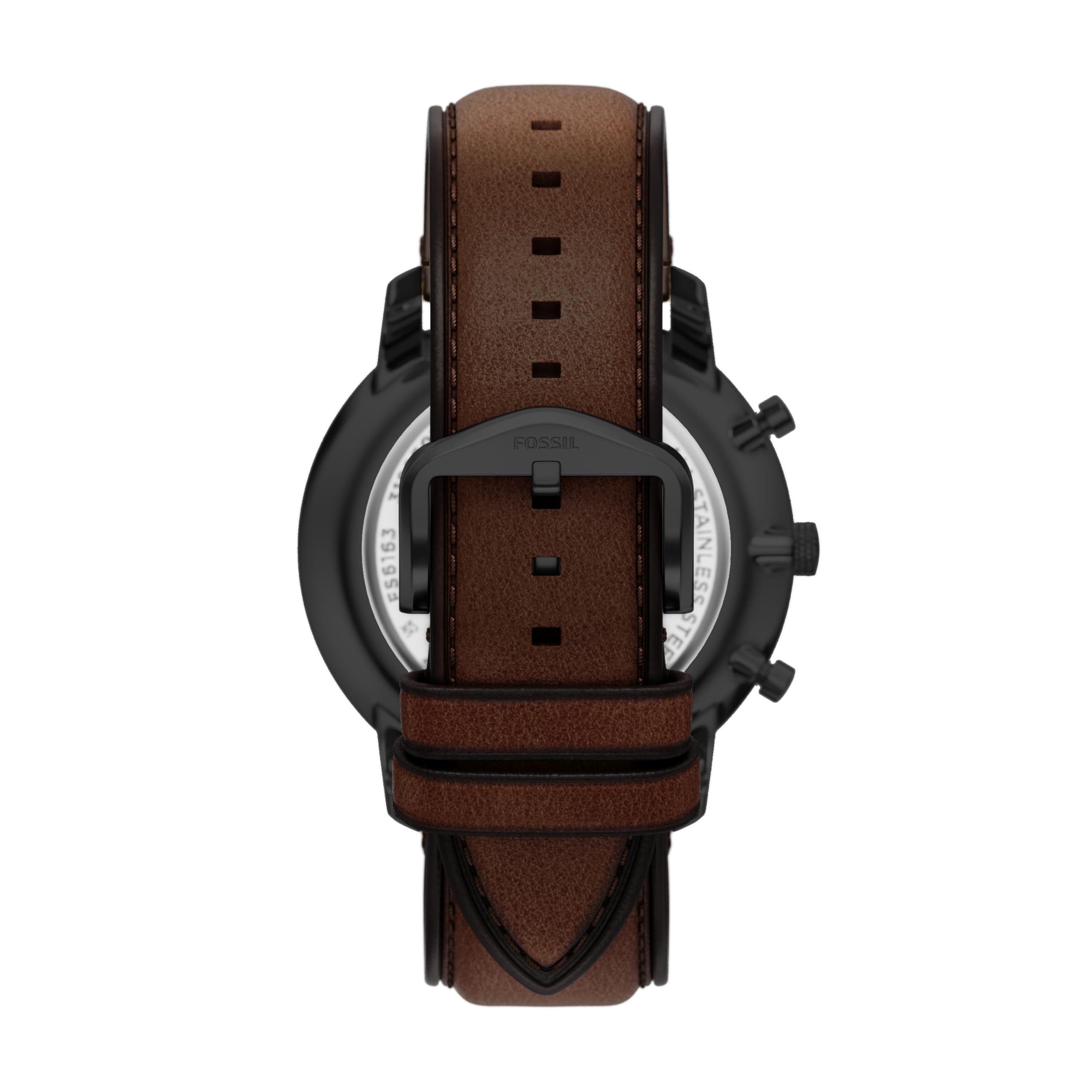 Meet Neutra, our mid-century-inspired chronograph. Sleek and minimalist, with a black sunray dial under an amber crystal and rich brown leather strap. A 44mm black stainless steel case houses precise quartz chronograph movement.