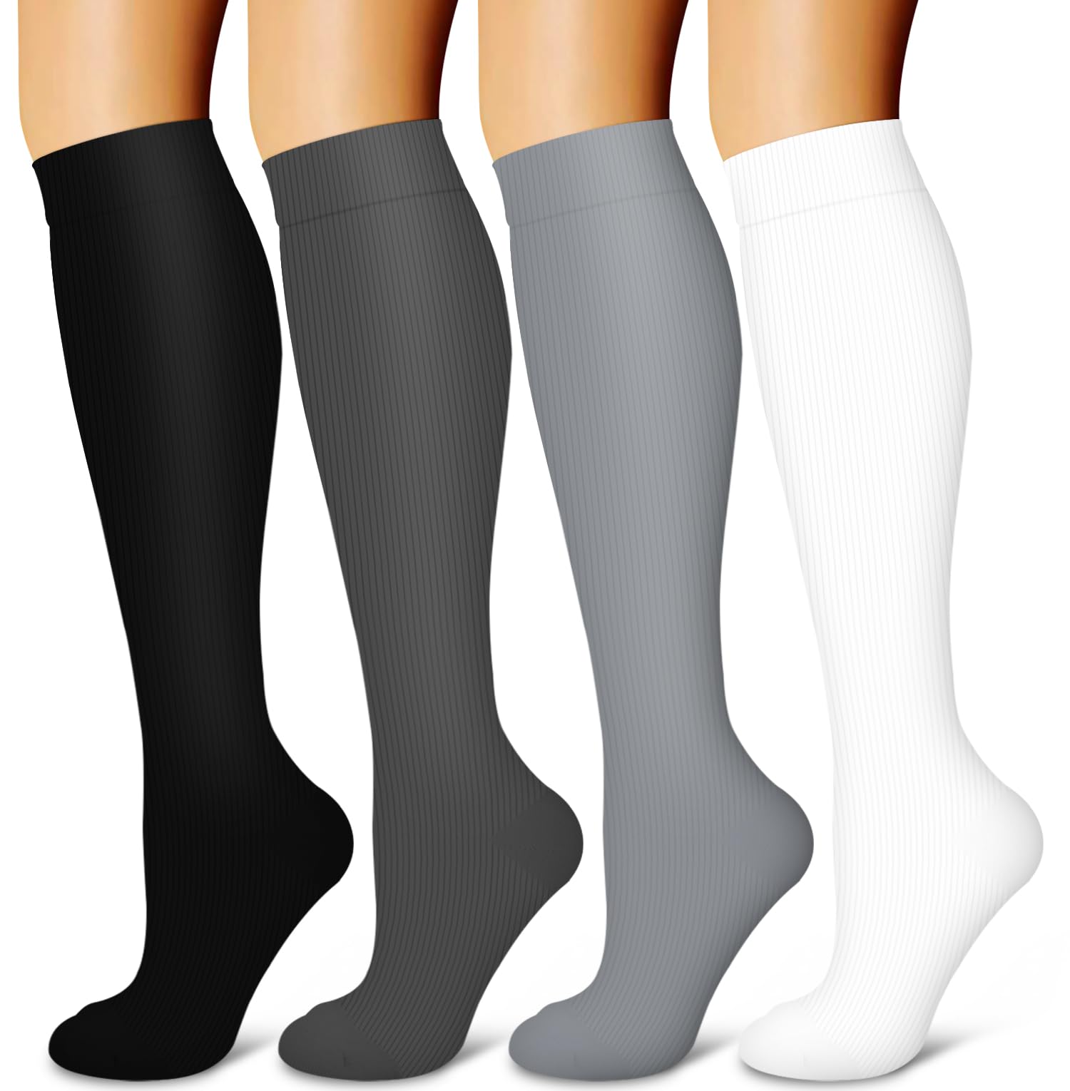 4 PAIRS OF UNISEX -Our compression socks are made up of high-quality Lycra fiber.The design is ergonomic to give ultimate comfort.You can best describe them in two words:flexible and durable. Affordable prices without sacrificing comfort, quality, and fashion.High performance material and temperature control,keeping your muscles cool during workouts and warm during rest.You can expect them to alleviate any mild leg pain and swelling that hinders a productive -free day.