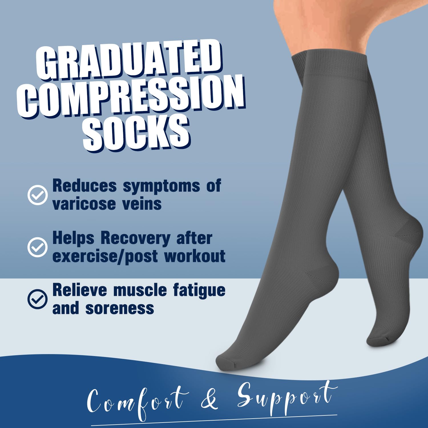 REVIVES&ENERGIZES-Our compression socks help relieve pain,improve circulation,boost leg stamina,support veins,reduce foot and leg soreness.Our compression socks are a lifesaver for those who don’t need a high level of compression but are still looking for a pair that would help maintain healthy legs.Sit + Stand + Travel + Recover,Slip on a pair of our socks,Increase Energy,Prevent Swelling,All Day Comfort.We aim to comfort every tired leg regardless of its age,gender,hobby,profession.