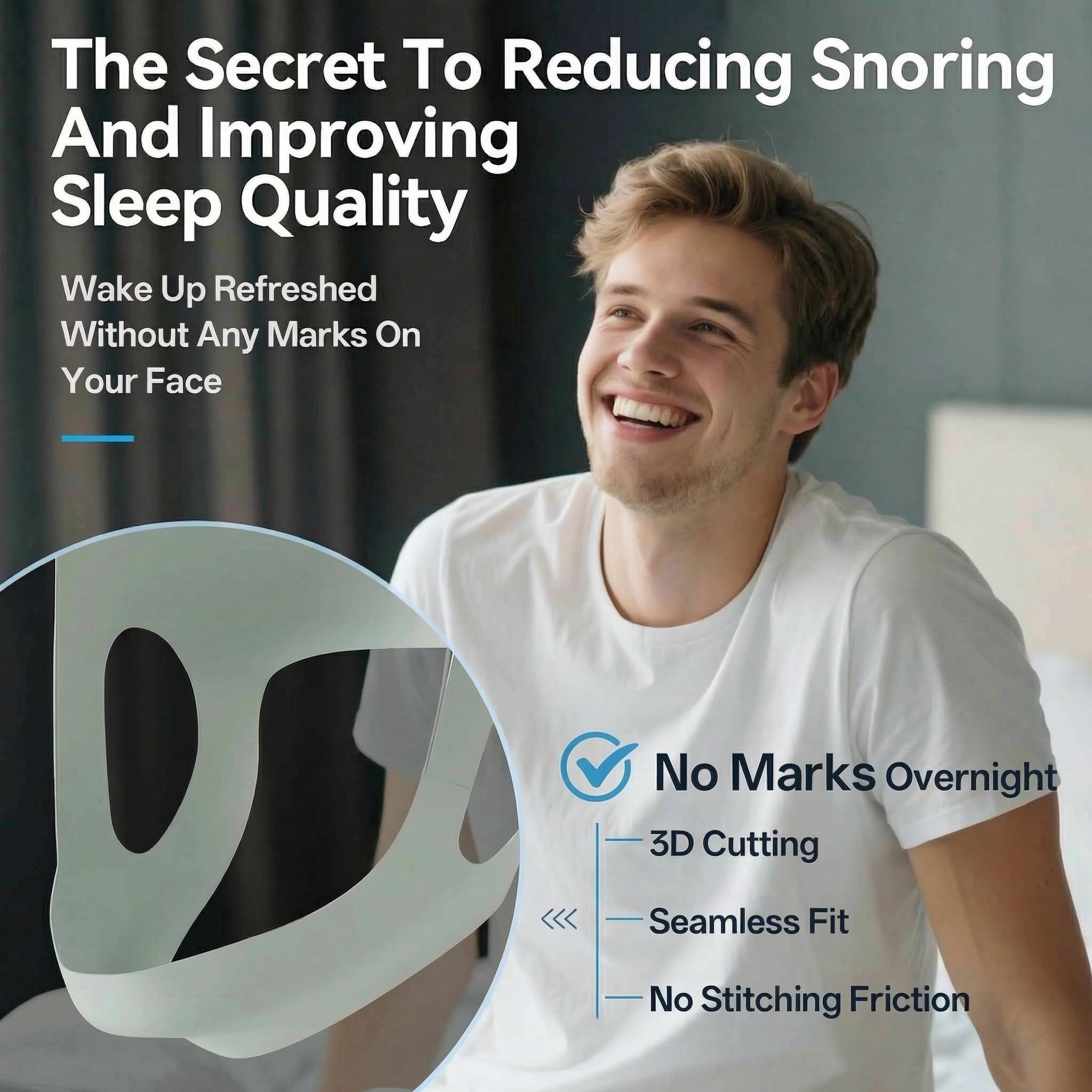 Comfortable All-Night Wear:Enjoy traceless sleep with our chin strap for sleeping. Made from advanced sports tight fabric and boasting a seamless design, it molds to your face for a snug fit. The one-piece molding ensures there are no irritating seams, so you can wake up without any marks on your skin