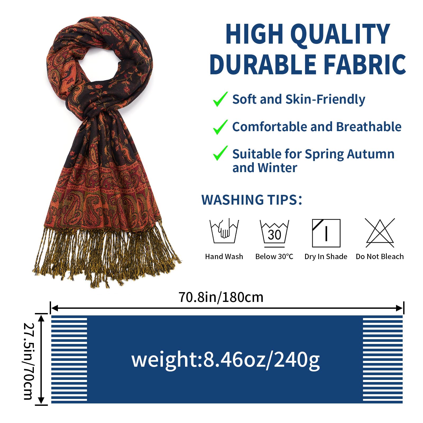 ★HIGH QUALITY MATERIAL - Our weaving pashmina scarves are made from a blend of fine viscose, acrylic and silk fabrics that drape nicely, soft and silky to the touch and breathable, and show a unique sheen when exposed to light. QIUTIMIY pashmina shawls are rich in color and durable. Won't fade or tear easily. Bringing you long-lasting beauty and practicality!