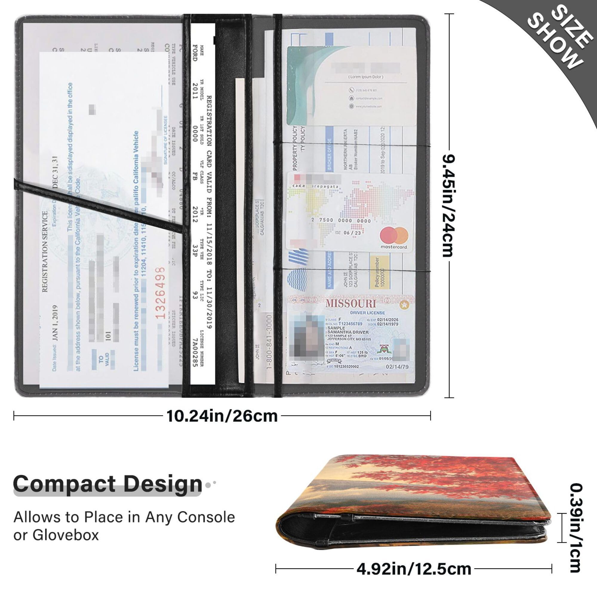 Product Dimension: 9.4 x 4.9 x 0.3 inches. Material: Faux Leather, PVC Features: 1. Perfect size to fit in any glove box or console. 2. Premium stitches and edge protection which is tear-resistant and ensures long-lasting use. 3. Slim and lightweight design which is perfect to organize your auto car document, registration, and insurance paperwork, business cards, ID, Driver's License, Key Contact Information Cards well organized 4. Keep your registration and insurance paperwork, business cards, emergency information together in the car glove box. The papers will not be scattered in the glove box anymore when owning this Registration and Insurance Card Holder.