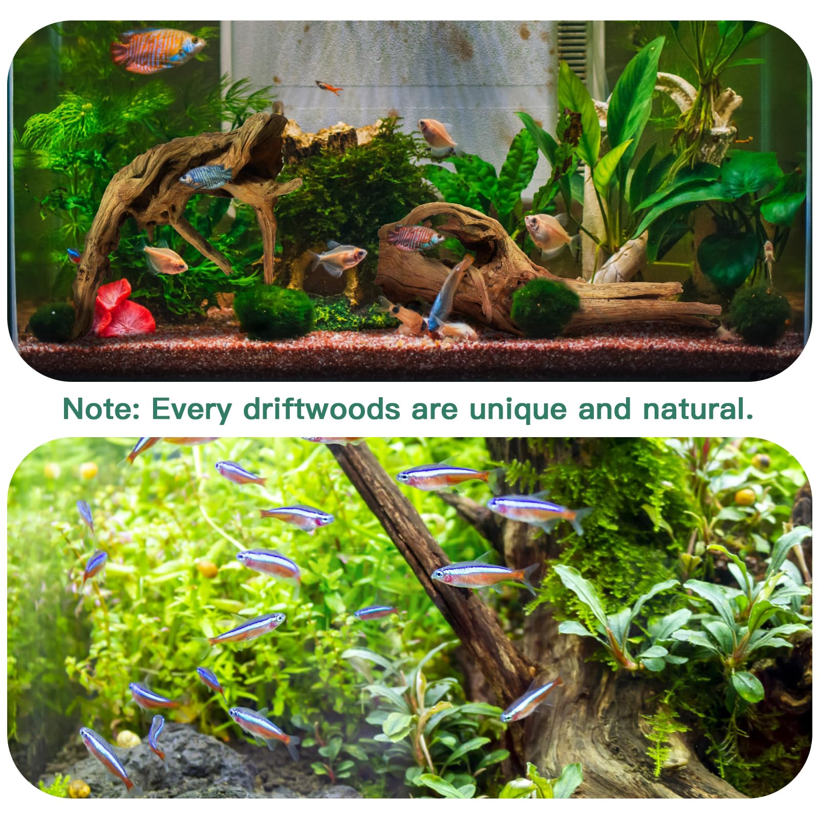 SAFE AND ROBUST -- Our high-quality aquarium driftwood can regulate the pH value and gH value of the fish tank freshwater, with features such as water softening and stable water quality. Driftwood branch is sturdy and durable, and it may have moss when placed in water for a long time, but they will become a delicious source of nutrition for fish, shrimp, turtles and other aquatic animals.