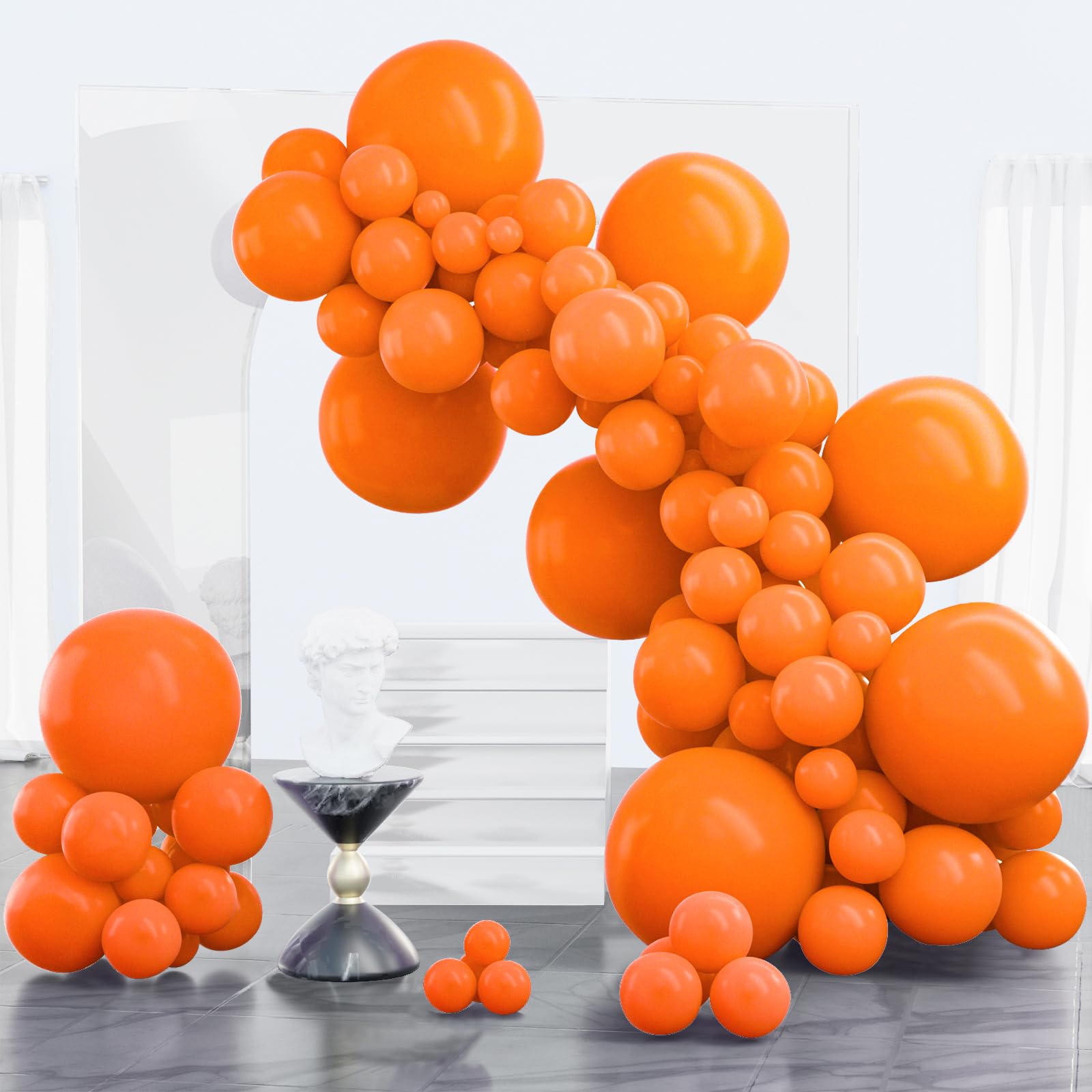 Package includes: 18 inch orange balloons (8pcs), 12 inch orange balloons (30pcs), 10 inch orange balloons (30pcs), 5 inch orange balloons (32pcs), in a solid consistent color. Pay attentions the 5 inch balloons could NOT float when inflated with HELIUM.