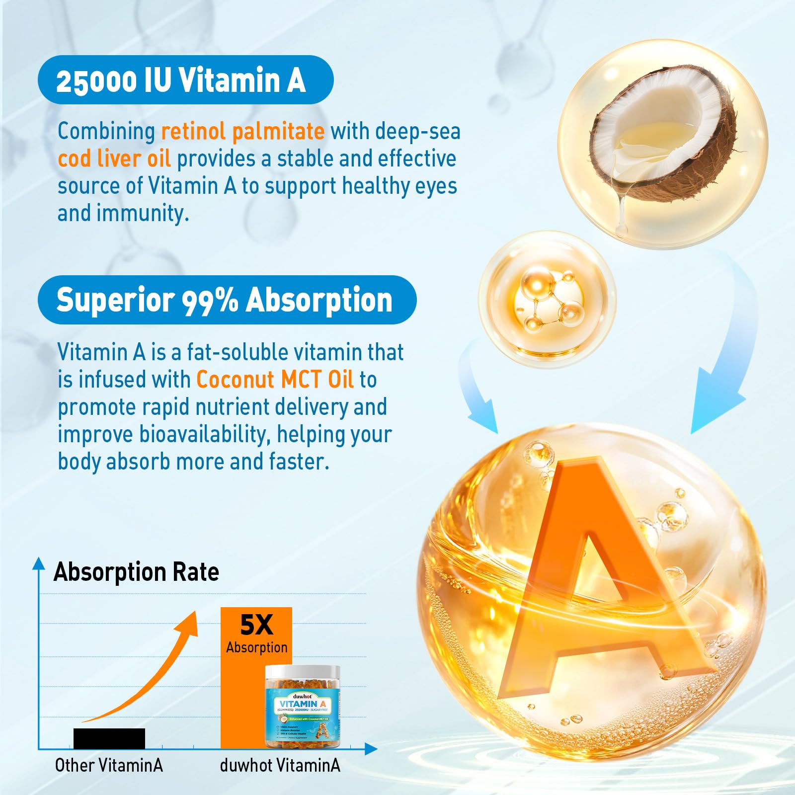 ENHANCED WITH MCT OIL: Vitamin A is a fat-soluble nutrient that requires healthy fats like coconut oil for optimal absorption. By combining it with MCT oil, this formula enhances nutrient delivery and bioavailability, helping your body absorb more, faster