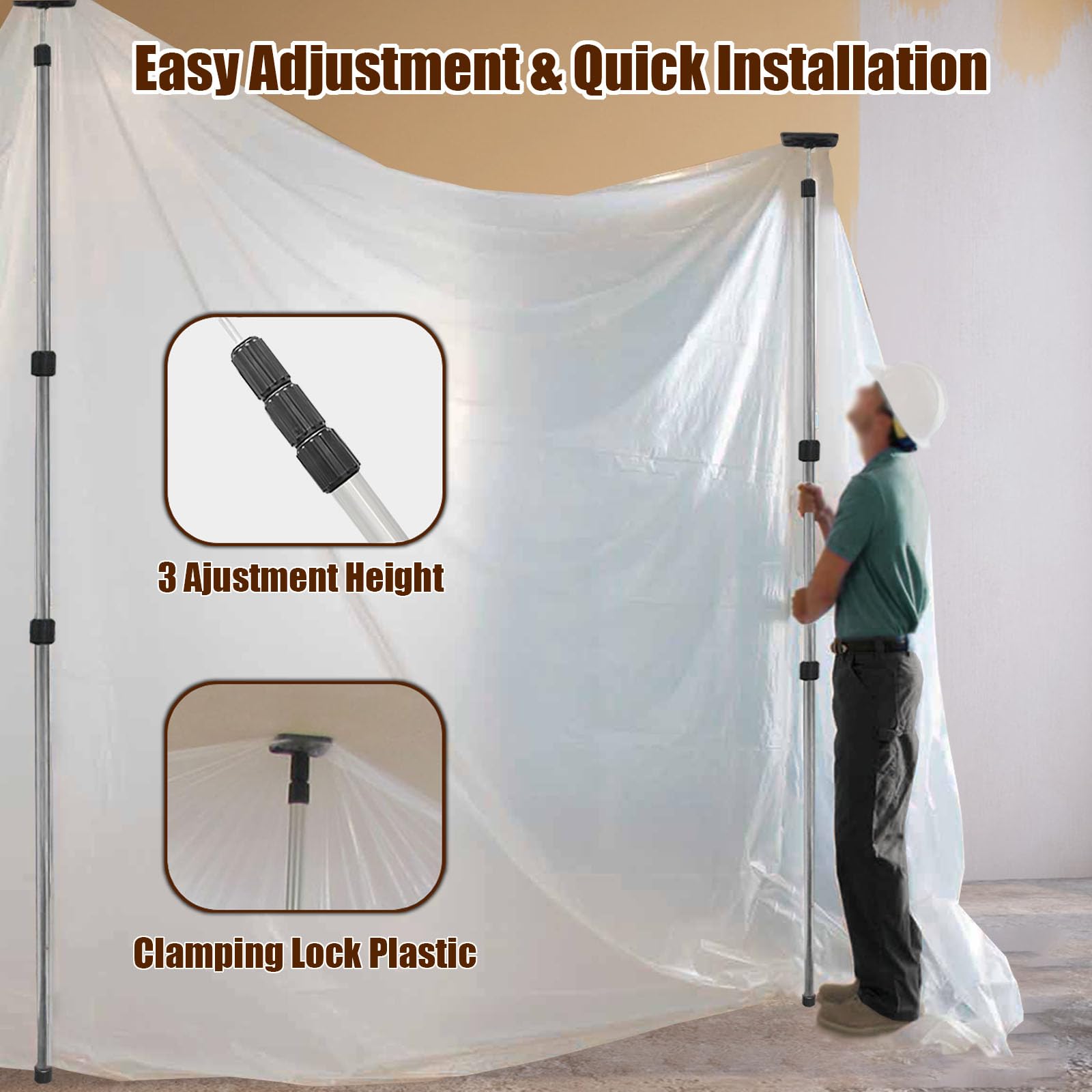 Easy Adjustment, Quick Installation: Clamp the plastic sheeting to the top of the telescoping pole, twist the lock, and adjust to the desired height without a ladder. Create a tight dust barrier in minutes.